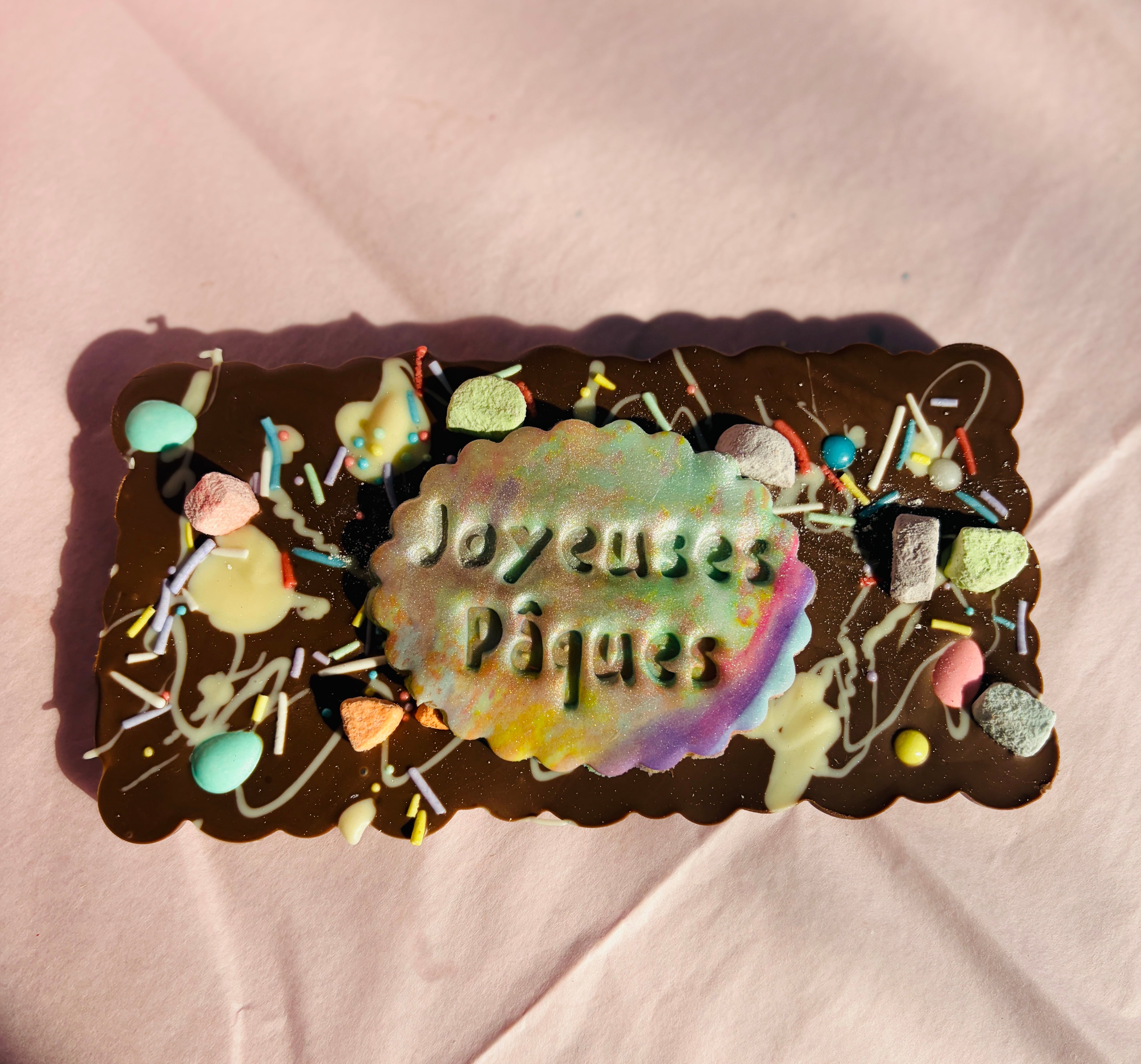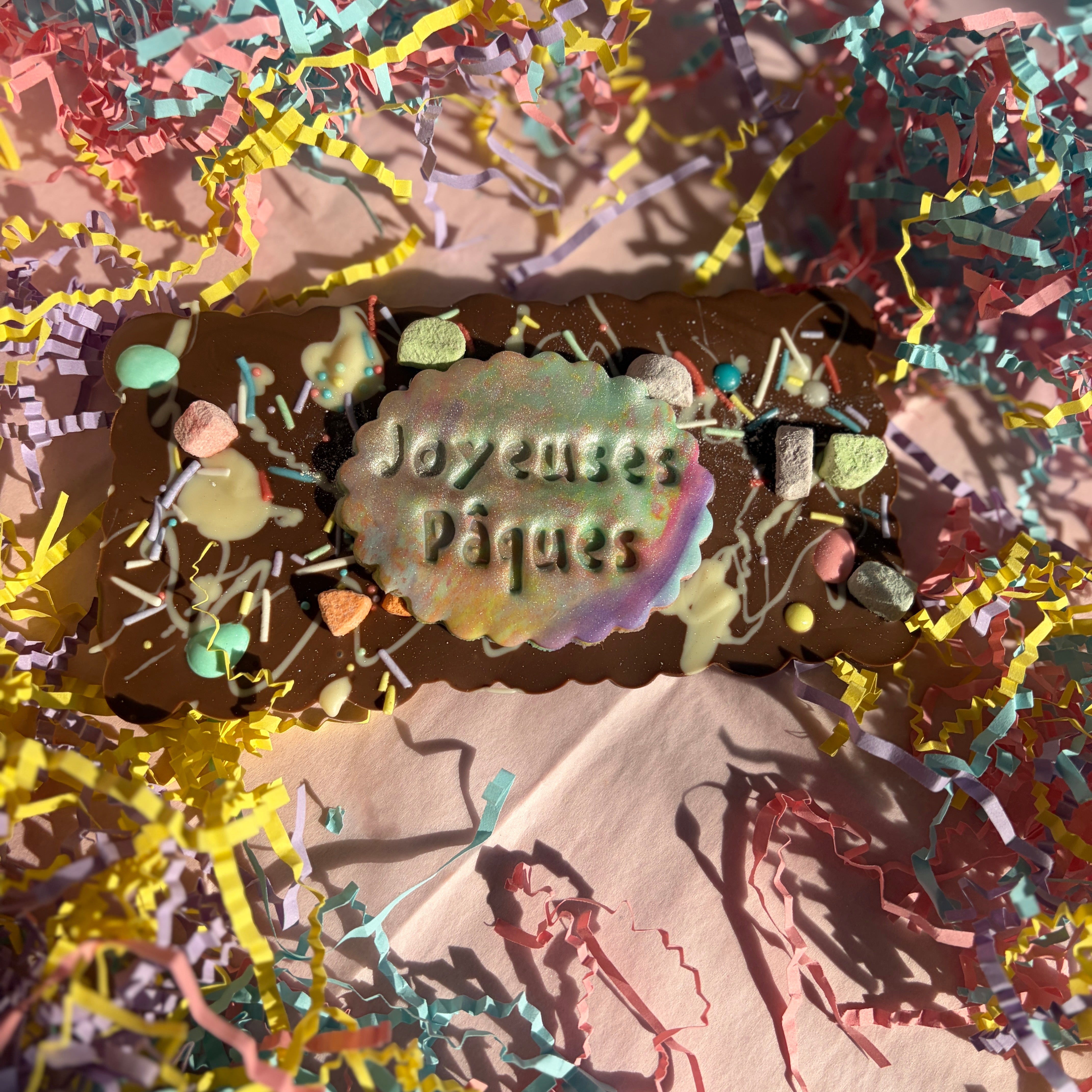 Une généreuse barre de chocolat au lait décorée à la main, garnie d’un filet de chocolat blanc et d’une explosion de décorations printanières colorées 🌈🐣