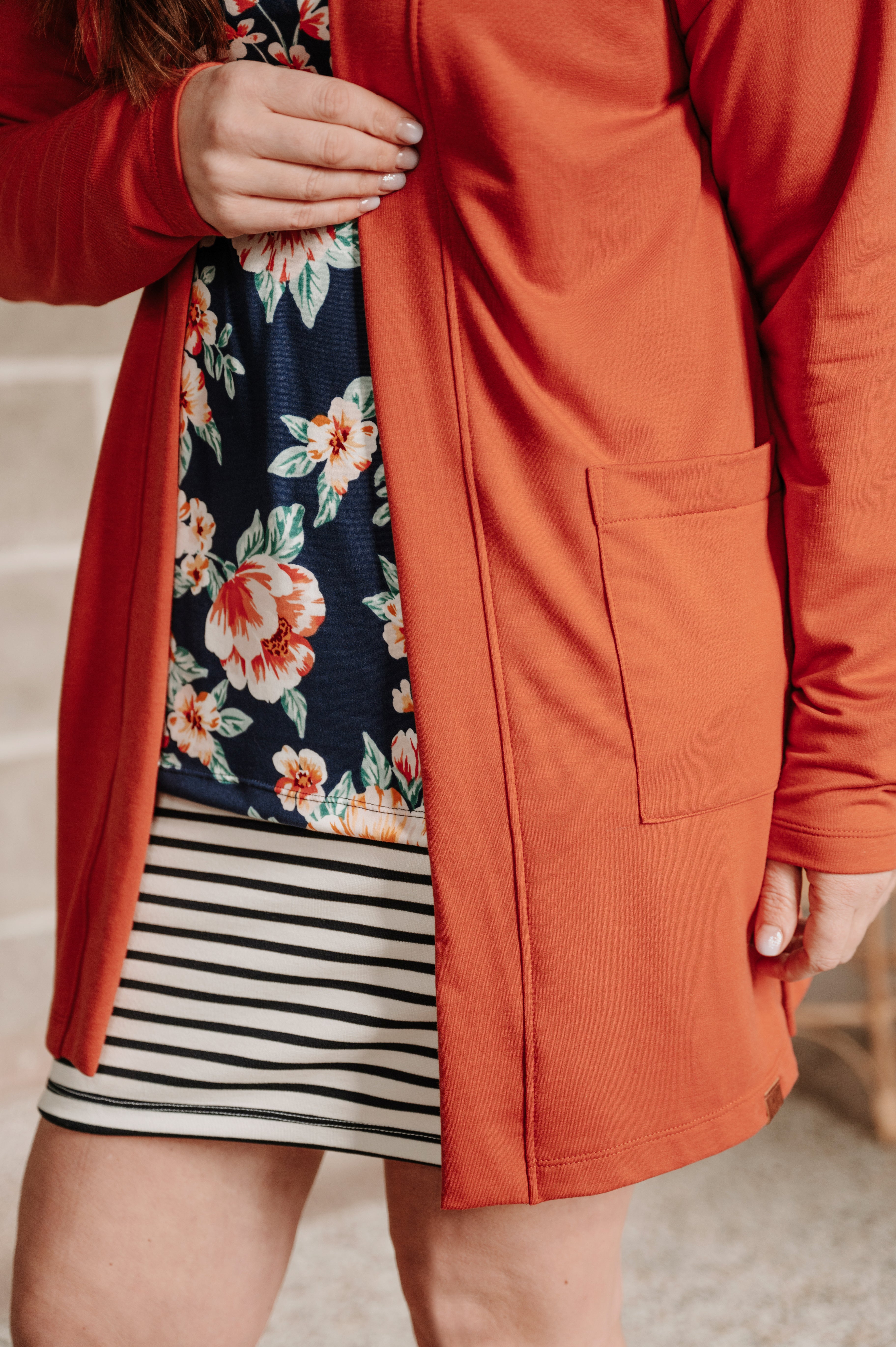 Ce cardigan est idéal pour être porté par-dessus nos modèles de jumpsuits pour ajouter une couche de chaleur et de style, mais il peut également être porté avec une variété d'autres tenues pour diverses occasions, y compris les mariages. De plus, le cardigan Love orangé en bambou pour femme peut être facilement porté pendant la maternité, car il se porte ouvert et offre une grande liberté de mouvement.