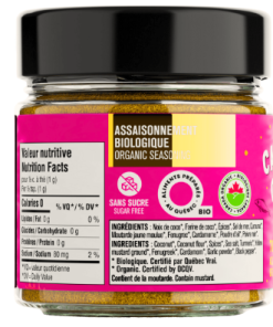 Ingrédients: Noix de coco, farine de coco, épices, sel de mer, curcuma, moutarde jaunes moulue, fenugrec, cardamome, poudre d'ail, poivre noir.