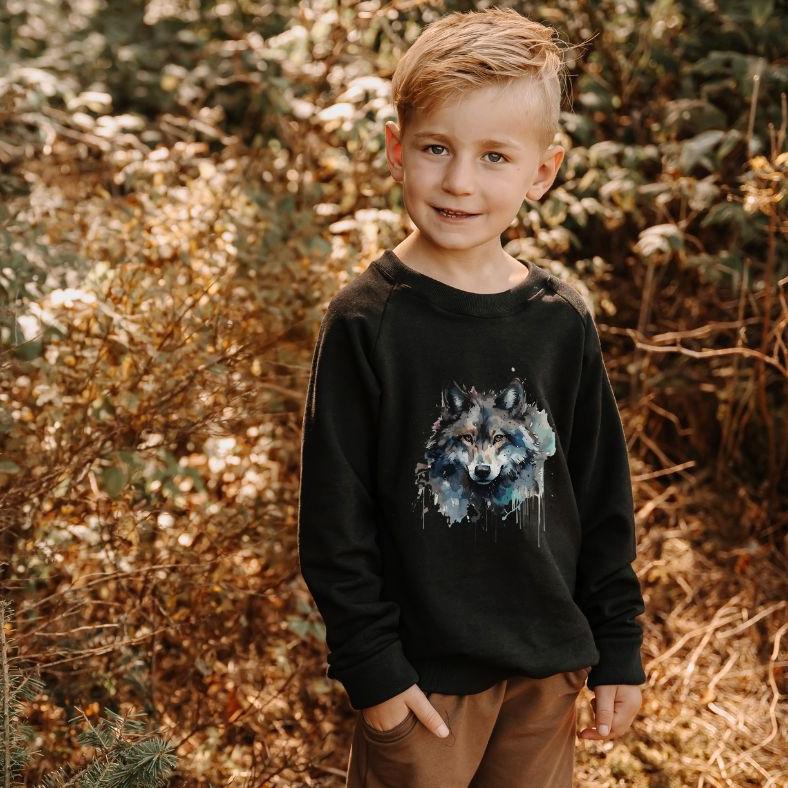 Chandail Crewneck noir pour enfant à manche longue en bambou fleece - Impression Mon loup
