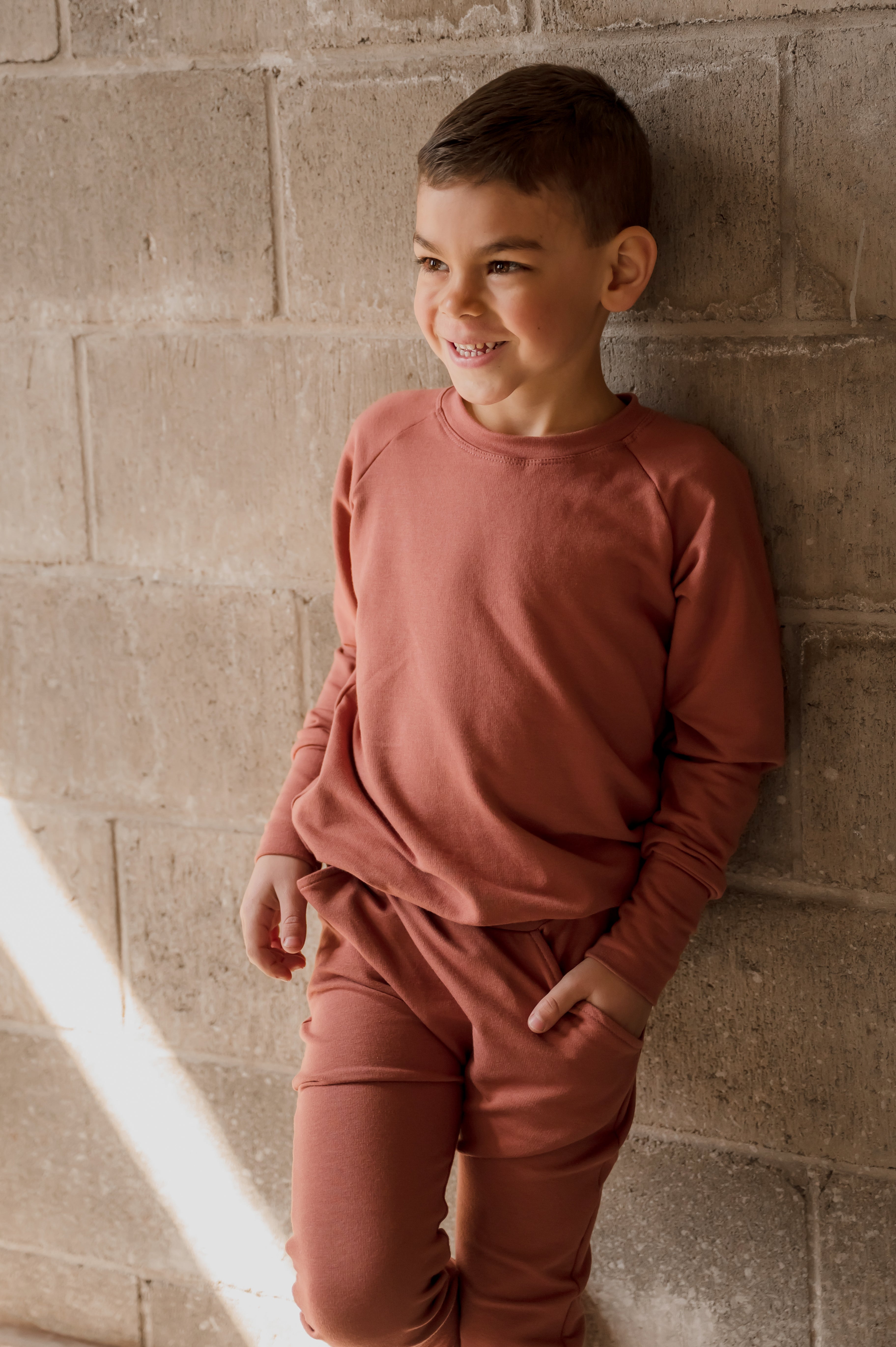 Chandail Crewneck rose brique pour enfant et junior à manche longue en bambou