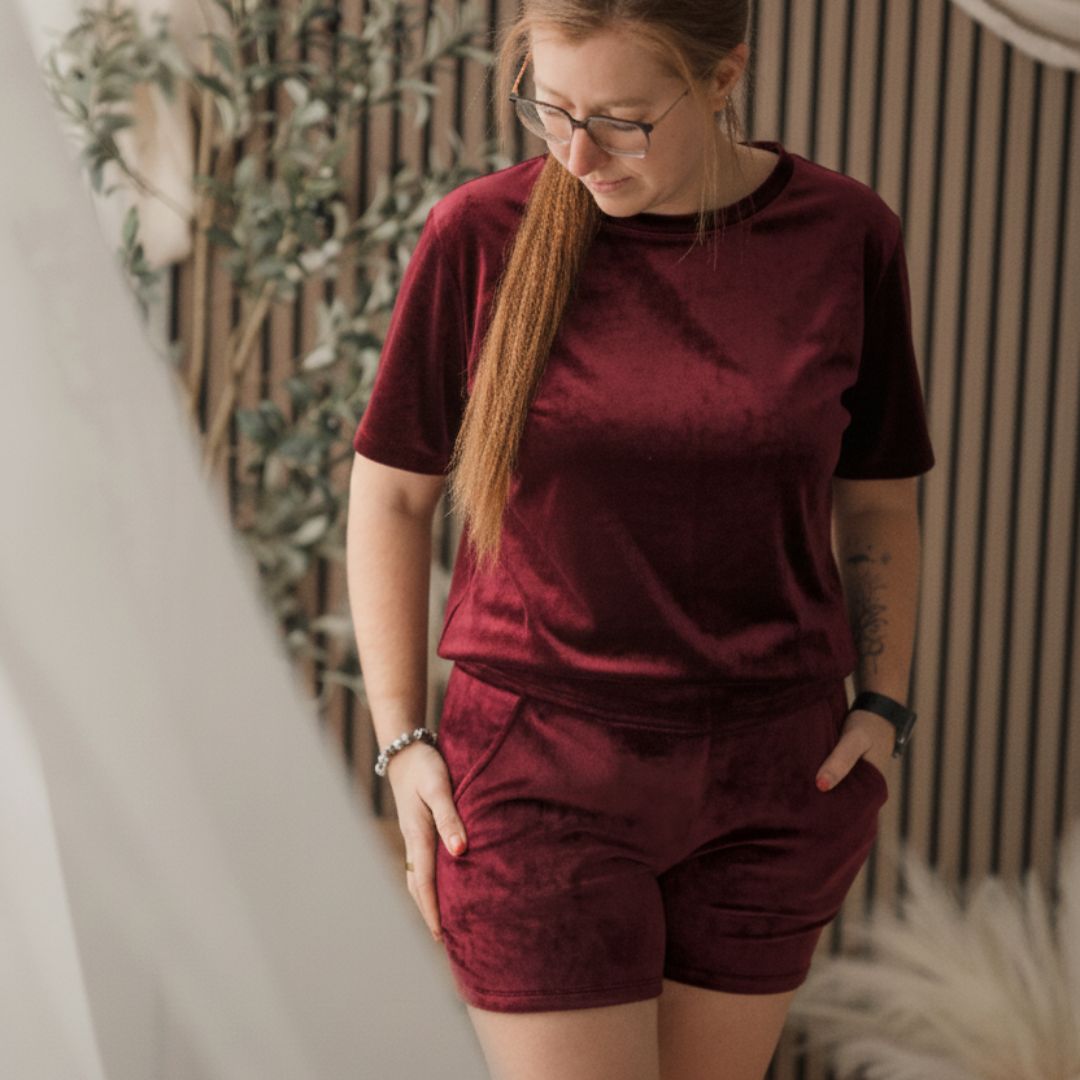 Chandail détente à manche courte rouge vin pour femme, idéal aussi pour la maternité
