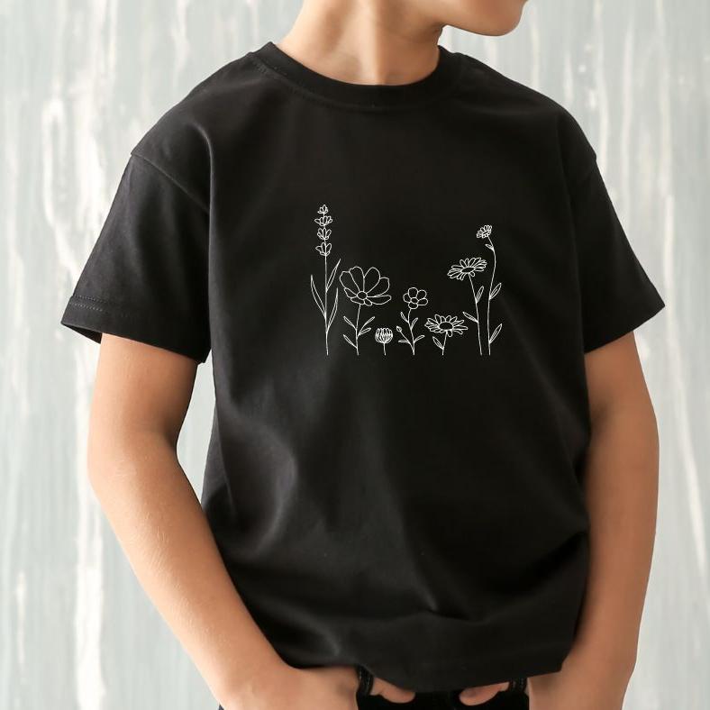 Chandail manche courte noir en bambou, grandeurs 2 à 16 ans - FLEURS