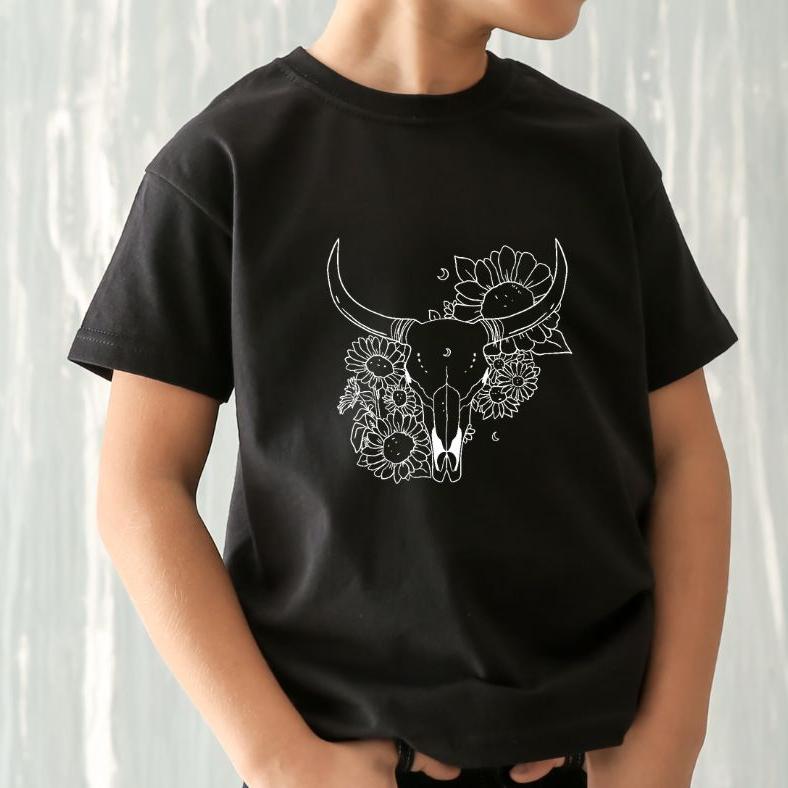 Chandail manche courte noir en bambou, grandeurs 2 à 16 ans - CRÂNE & FLEURS