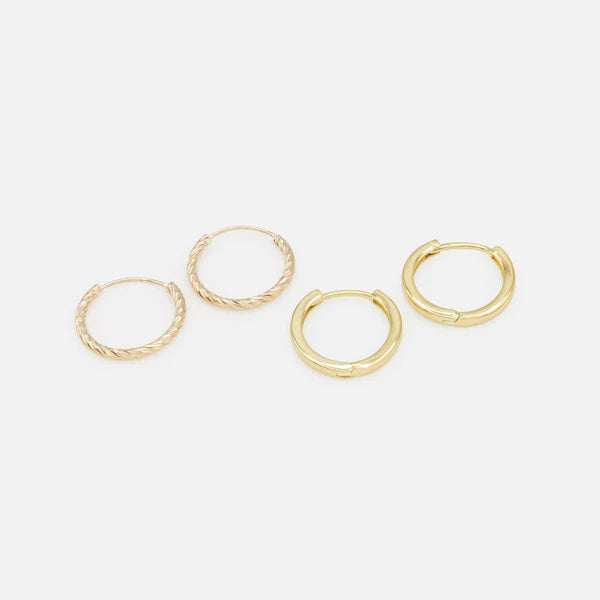 Ce duo de boucles d’oreilles dorées est un incontournable pour compléter vos looks au quotidien. Le premier modèle présente un anneau lisse et intemporel, tandis que le second arbore une délicate texture torsadée qui apporte une touche moderne et sophistiquée. Polyvalentes et élégantes, elles peuvent se porter seules pour un style épuré ou ensemble pour créer un jeu de contrastes subtils.