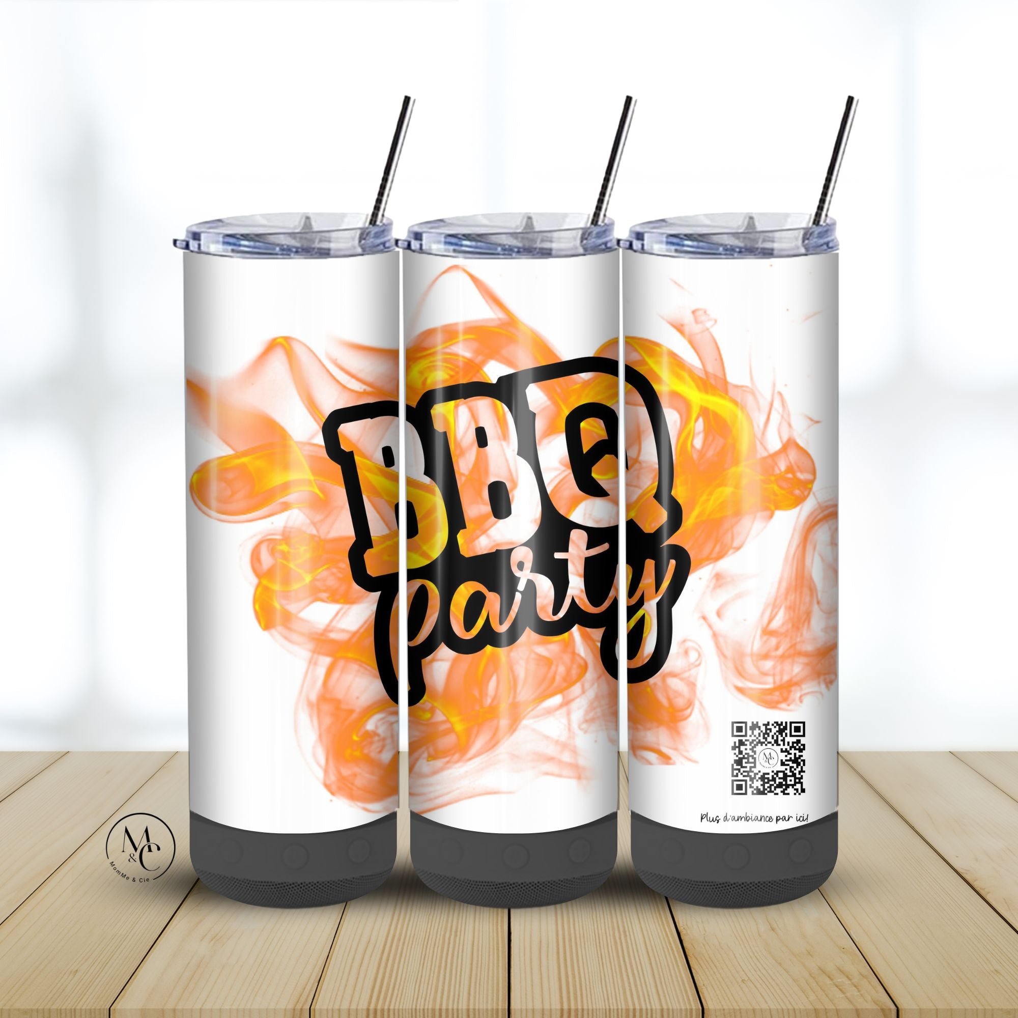 Le gobelet vient avec un code QR menant à une playlist exclusive MomMe&Cie, conçue pour mettre l’ambiance selon la thématique choisie (country vibes, motivation, camping, etc.). Une touche unique signée MomMe!