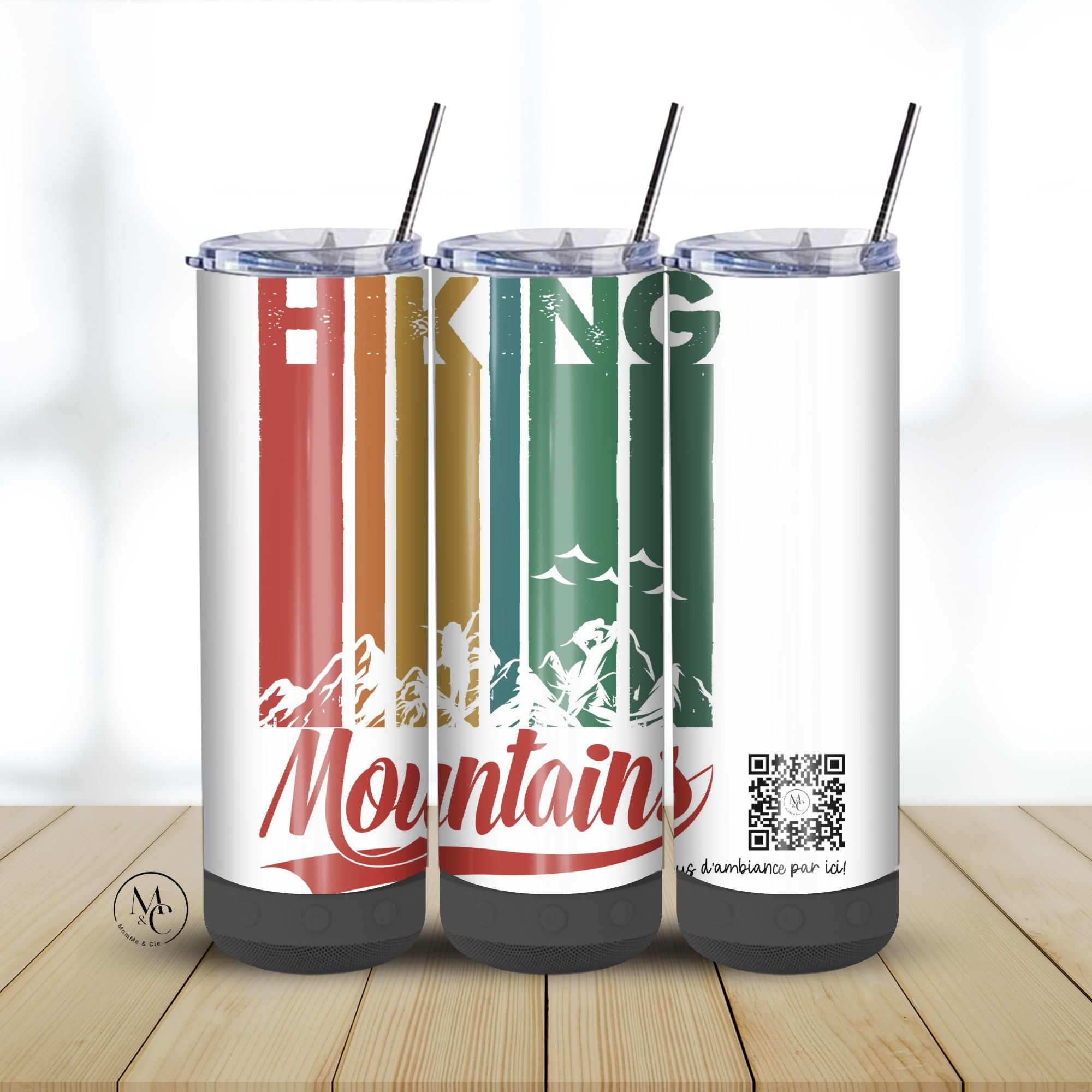 Le gobelet vient avec un code QR menant à une playlist exclusive MomMe&Cie, conçue pour mettre l’ambiance selon la thématique choisie (country vibes, motivation, camping, etc.). Une touche unique signée MomMe!