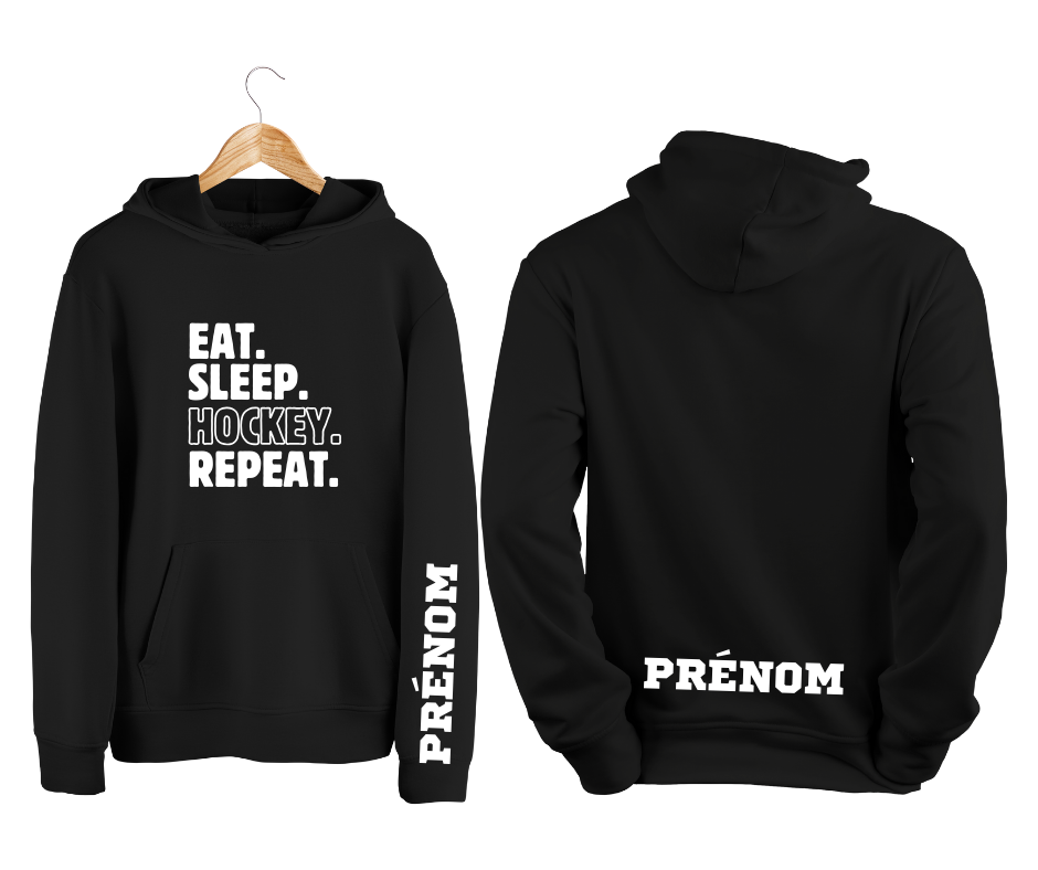 Hoodie avec poche kangourou enfant et junior en bambou noir Eat, Sleep, Hockey, Repeat