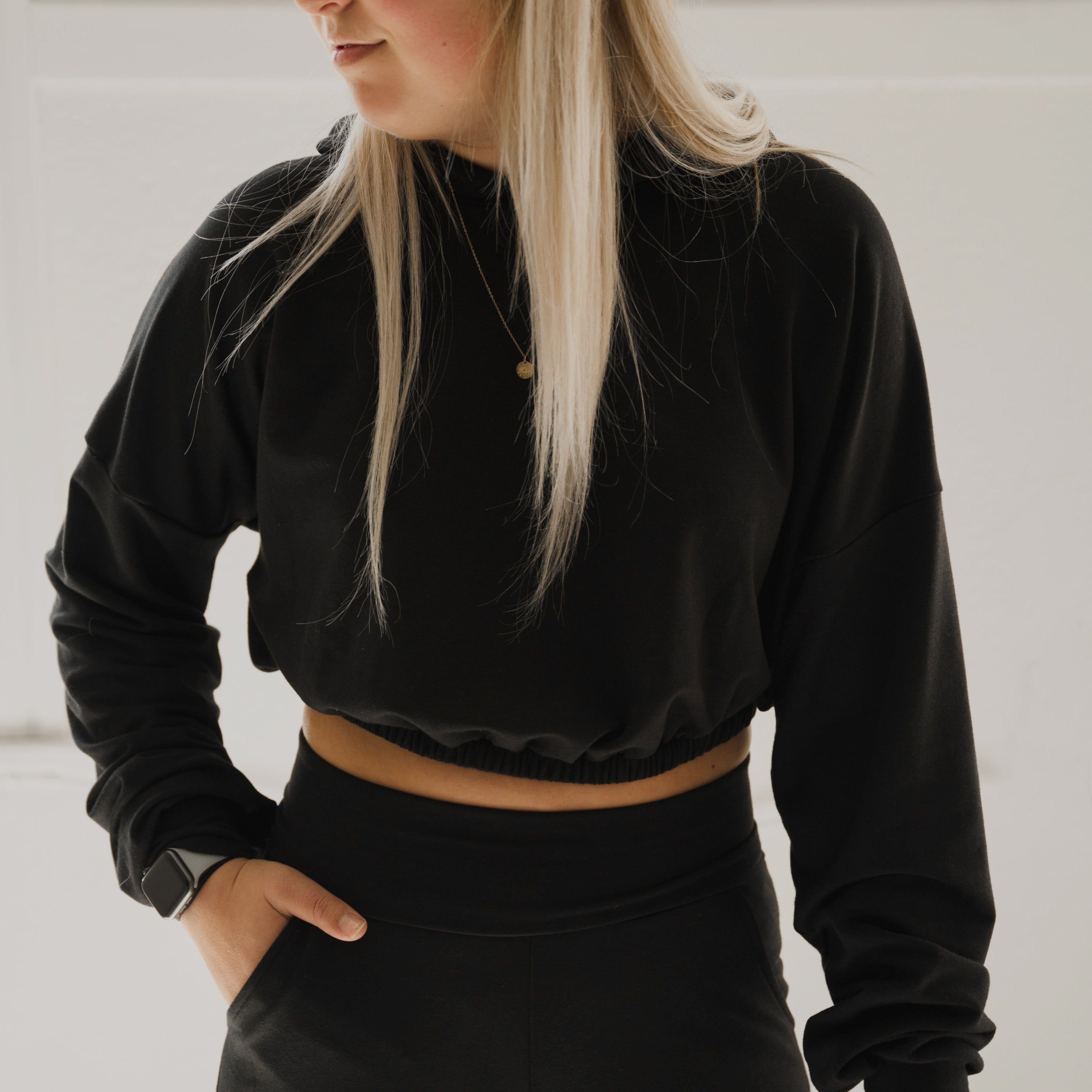Hoodie crop manche longue en bambou noir avec élastique à la taille pour femme - COUNTRY GIRL