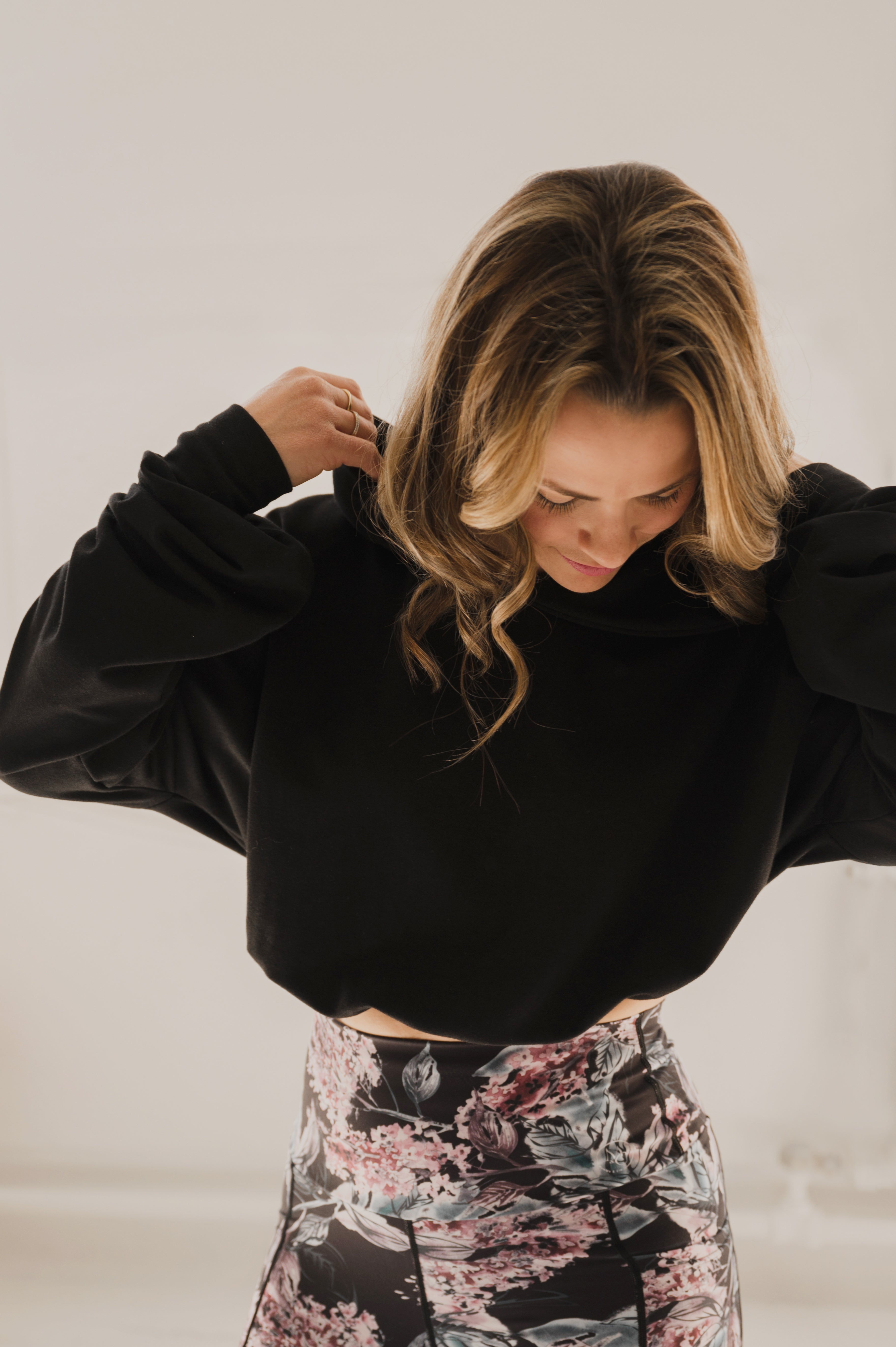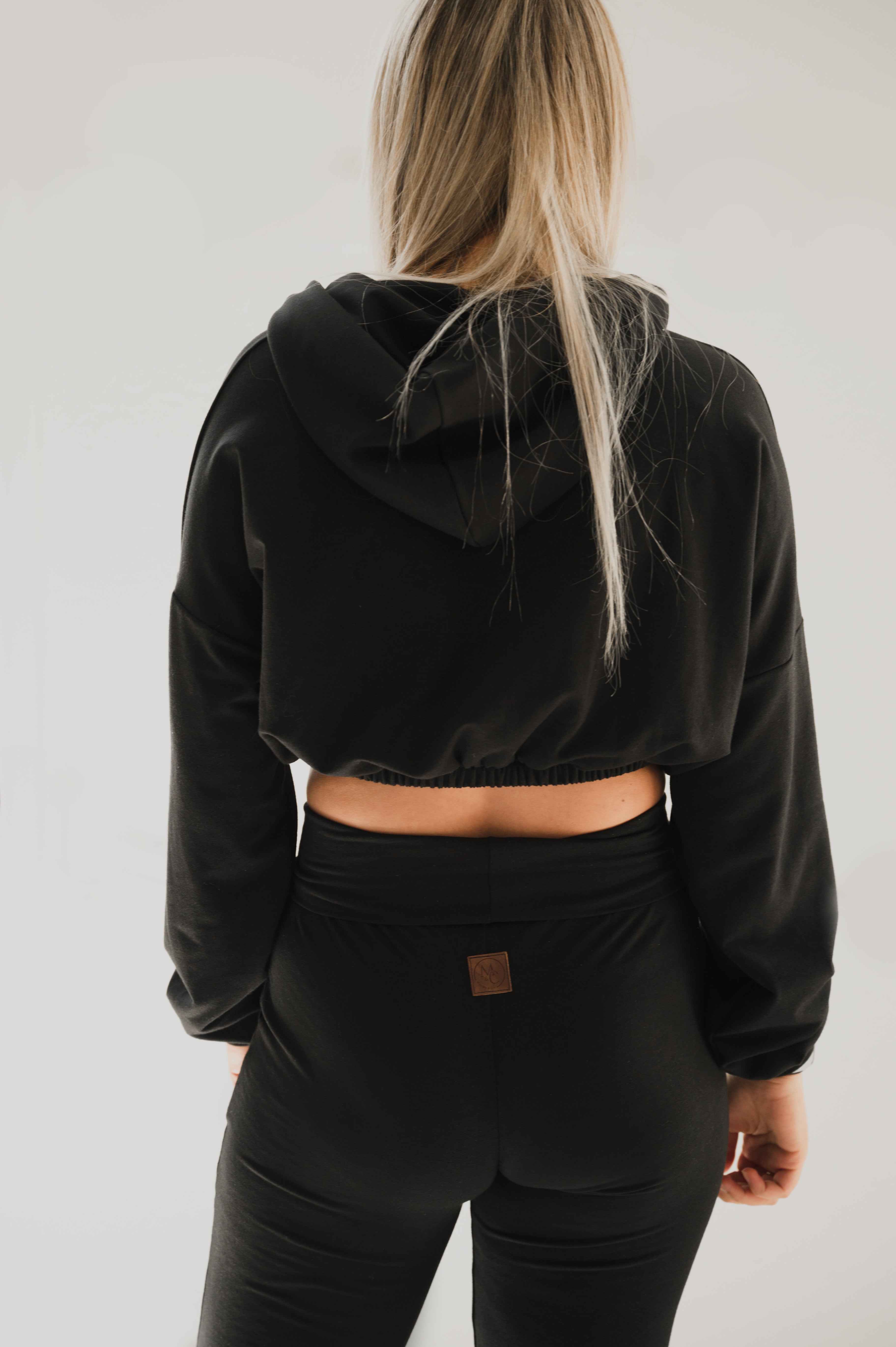 Que ce soit pour une séance d'entraînement, une journée de détente à la maison ou une sortie entre amis, le Hoodie crop en bambou noir de MomMe & Cie est le choix parfait pour un style décontracté et chic en toute occasion.