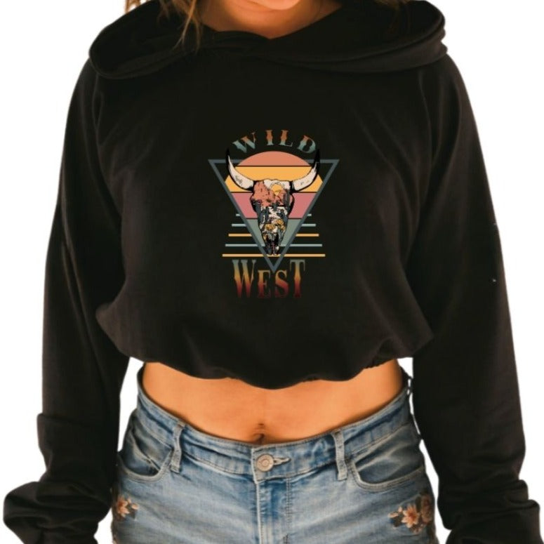Hoodie crop manche longue en bambou noir avec élastique à la taille pour femme - WILD WEST