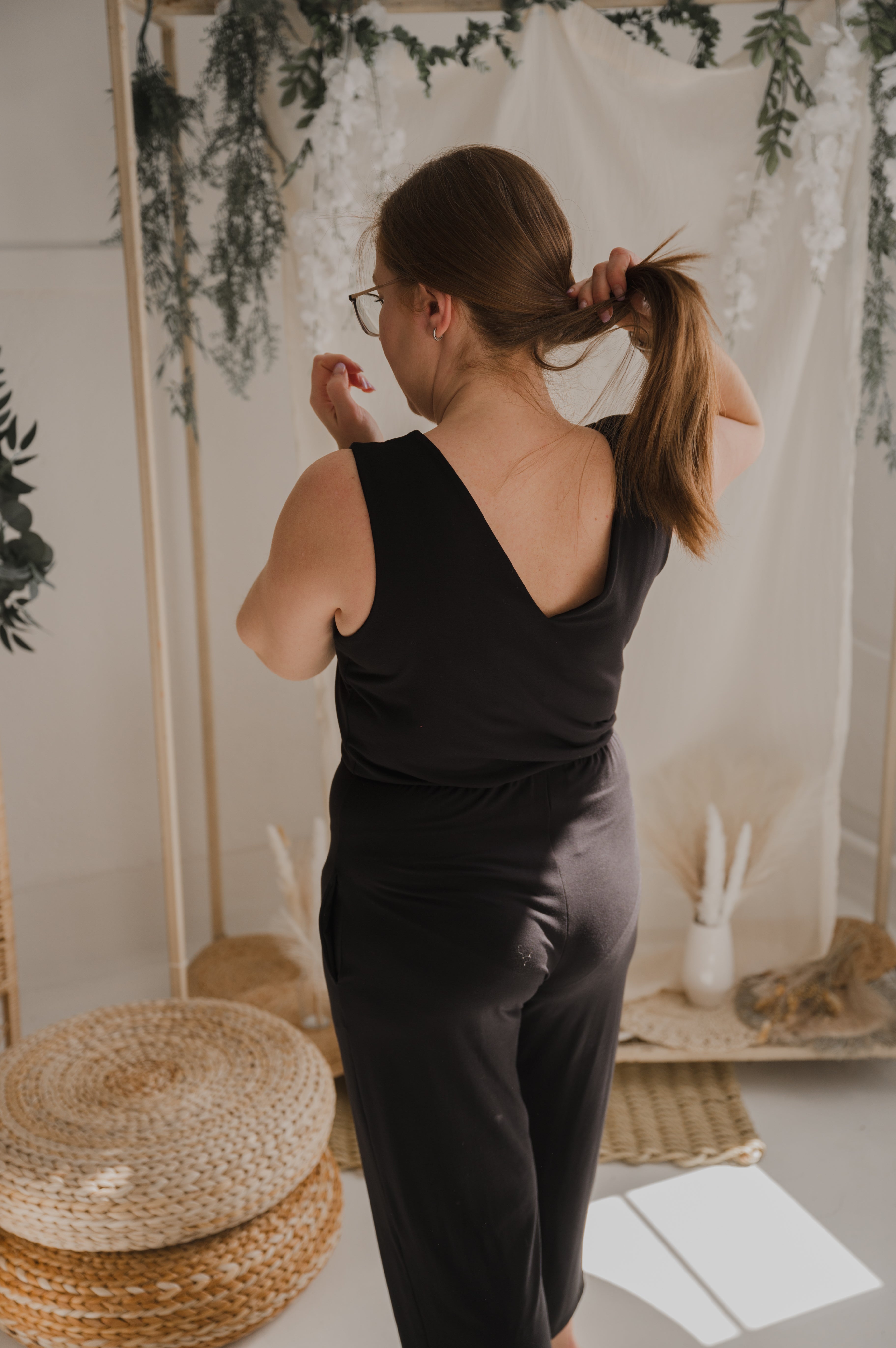 Le jumpsuit Mary à jambe évasée noir en bambou pour femme est une pièce intemporelle et pratique, idéale pour la maternité et la vie quotidienne. Il est disponible en différentes tailles pour s'adapter à toutes les morphologies.