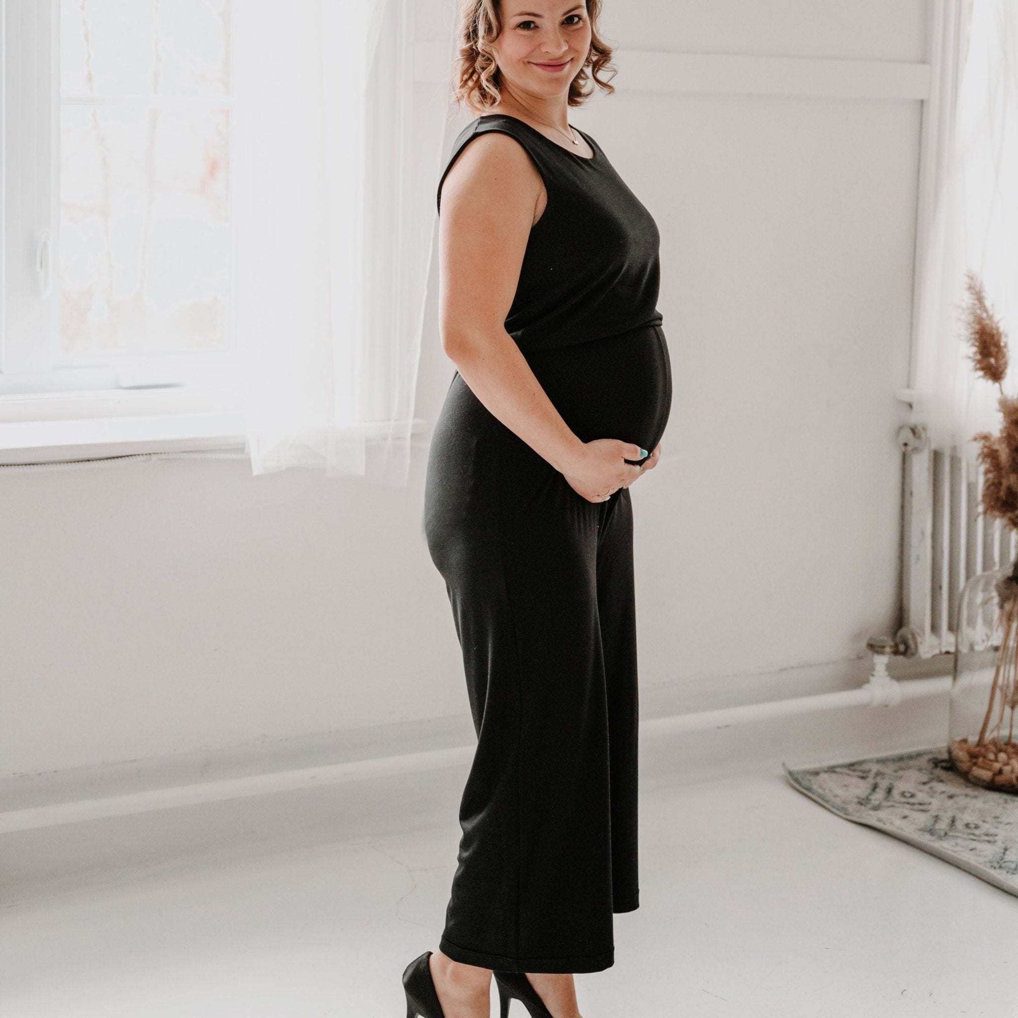 Jumpsuit Mary à jambe évasée noir en bambou pour femme avec poches latérales et élastique à la taille. Idéal pour la maternité.
