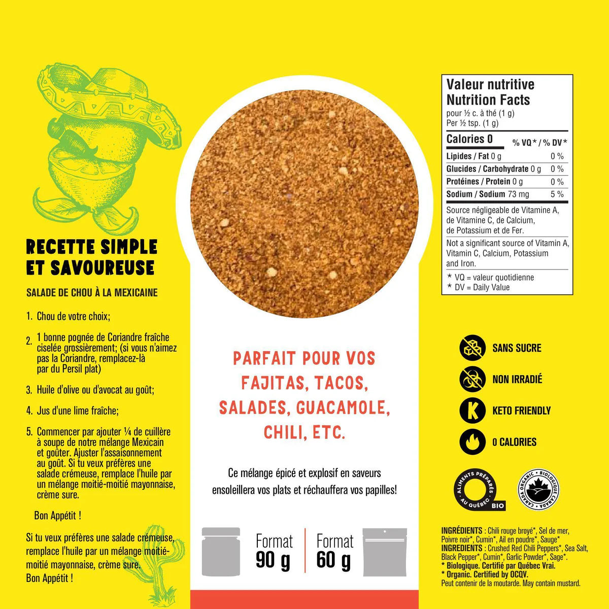 Notre mélange Mexicain est le plus piquant de nos assaisonnements. Il est vraiment délicieux et authentique mais, on recommande d'en mettre une petite quantité pour débuter et d'ajuster selon le degré de tolérance aux saveurs piquantes.