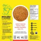 INGRÉDIENTS: Chili, Cumin, ail en poudre, poivre noir, sauge et sel de mer.
