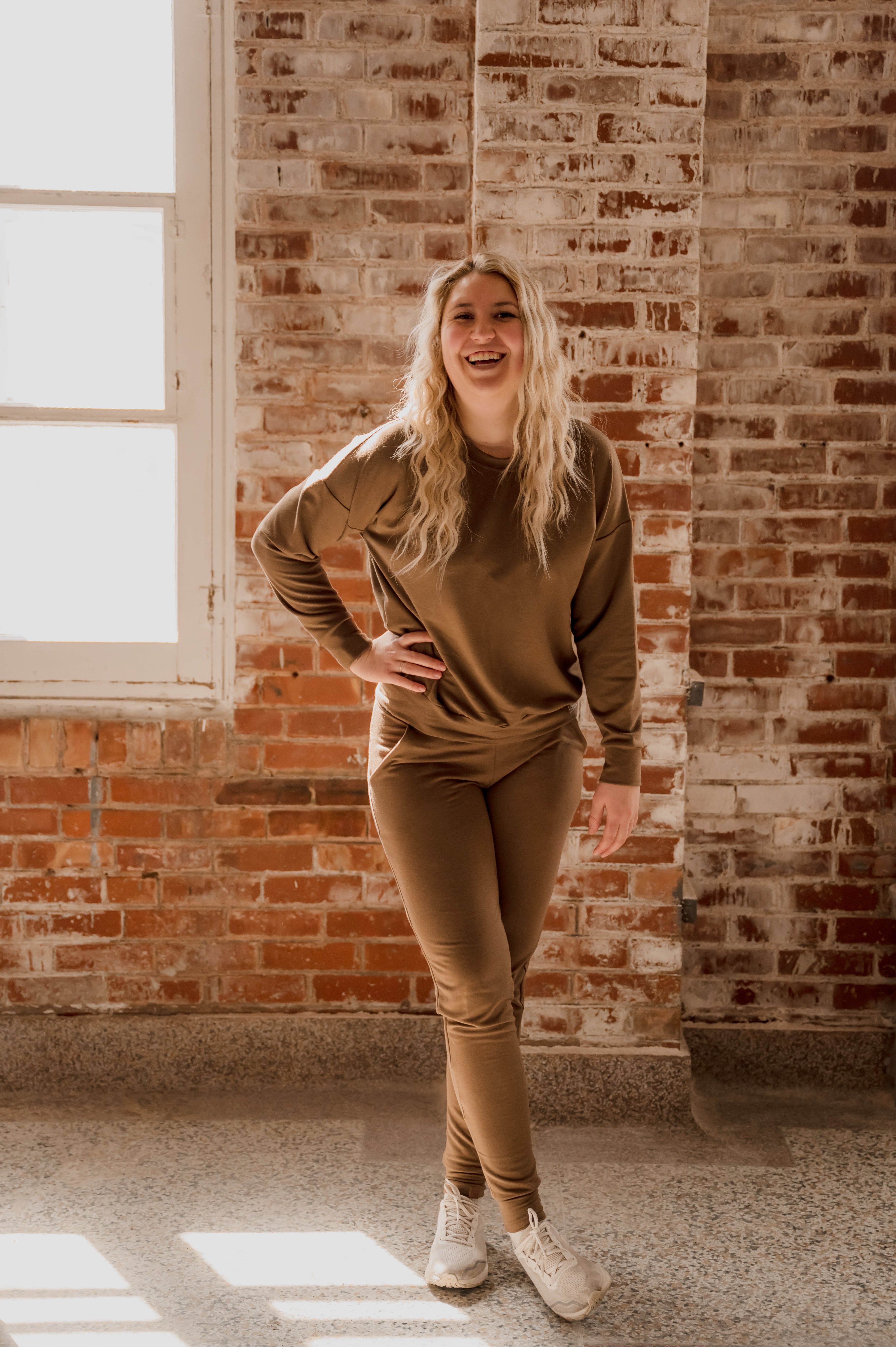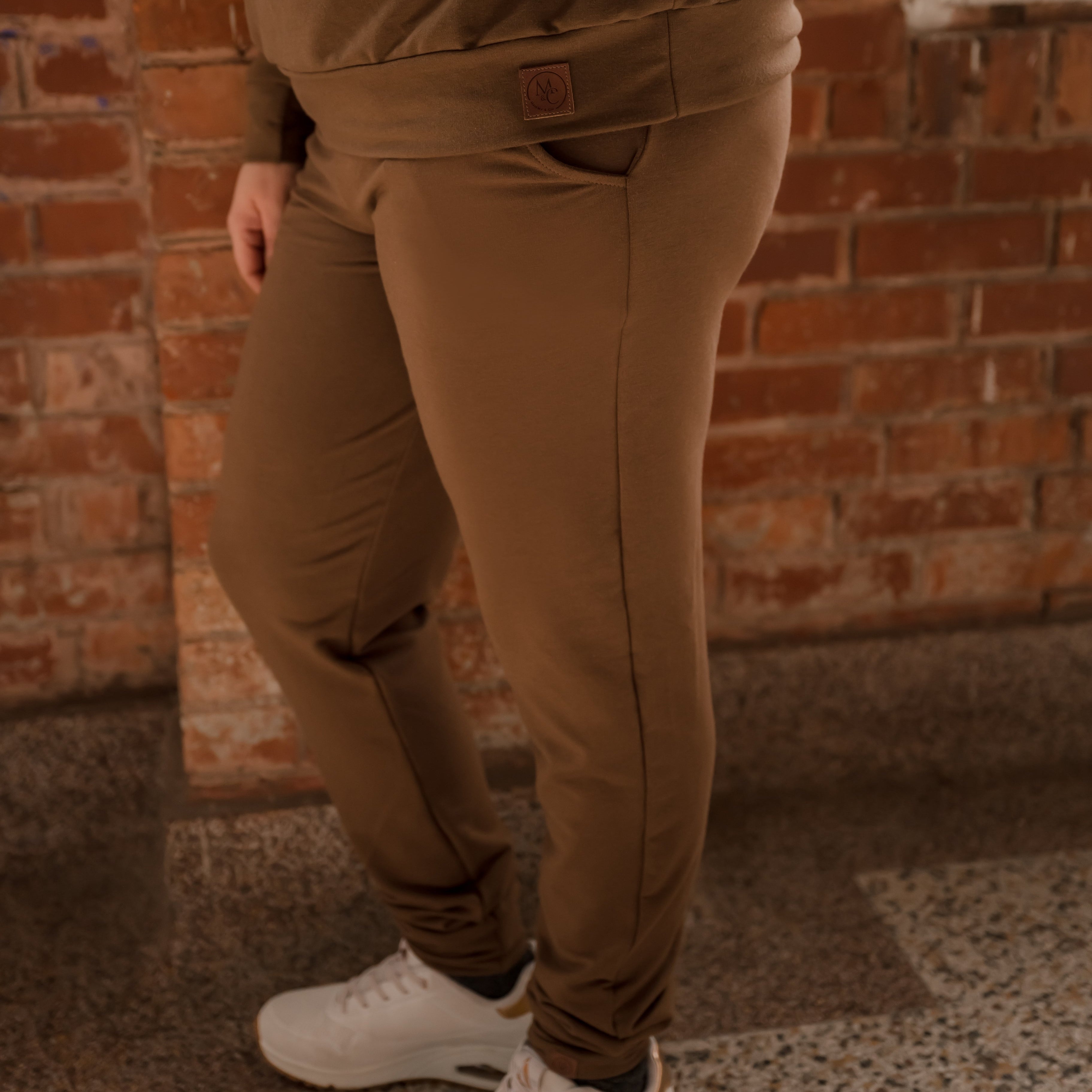 Pantalon style jogger pour femme en bambou café latté, idéal pour la maternité