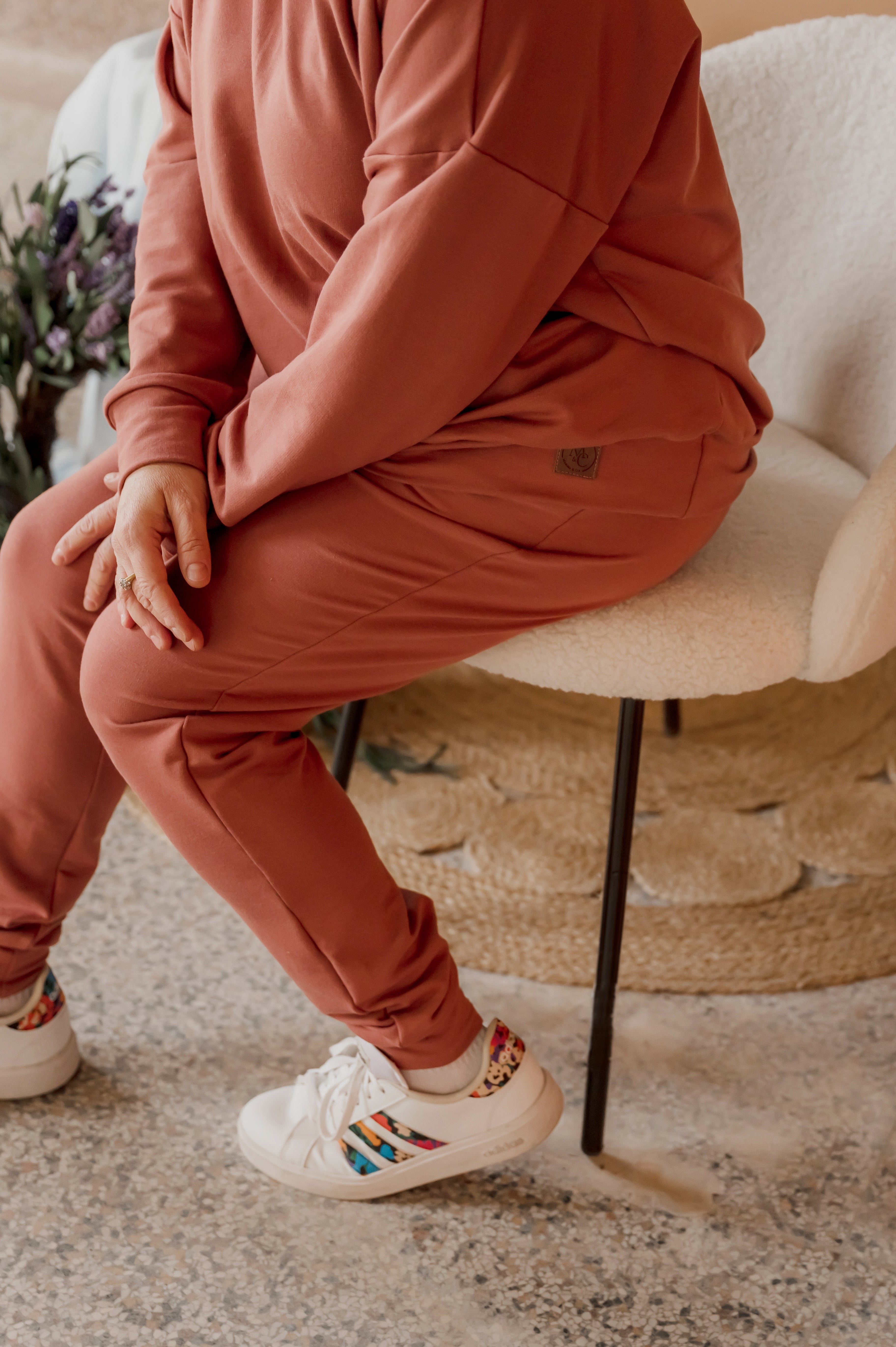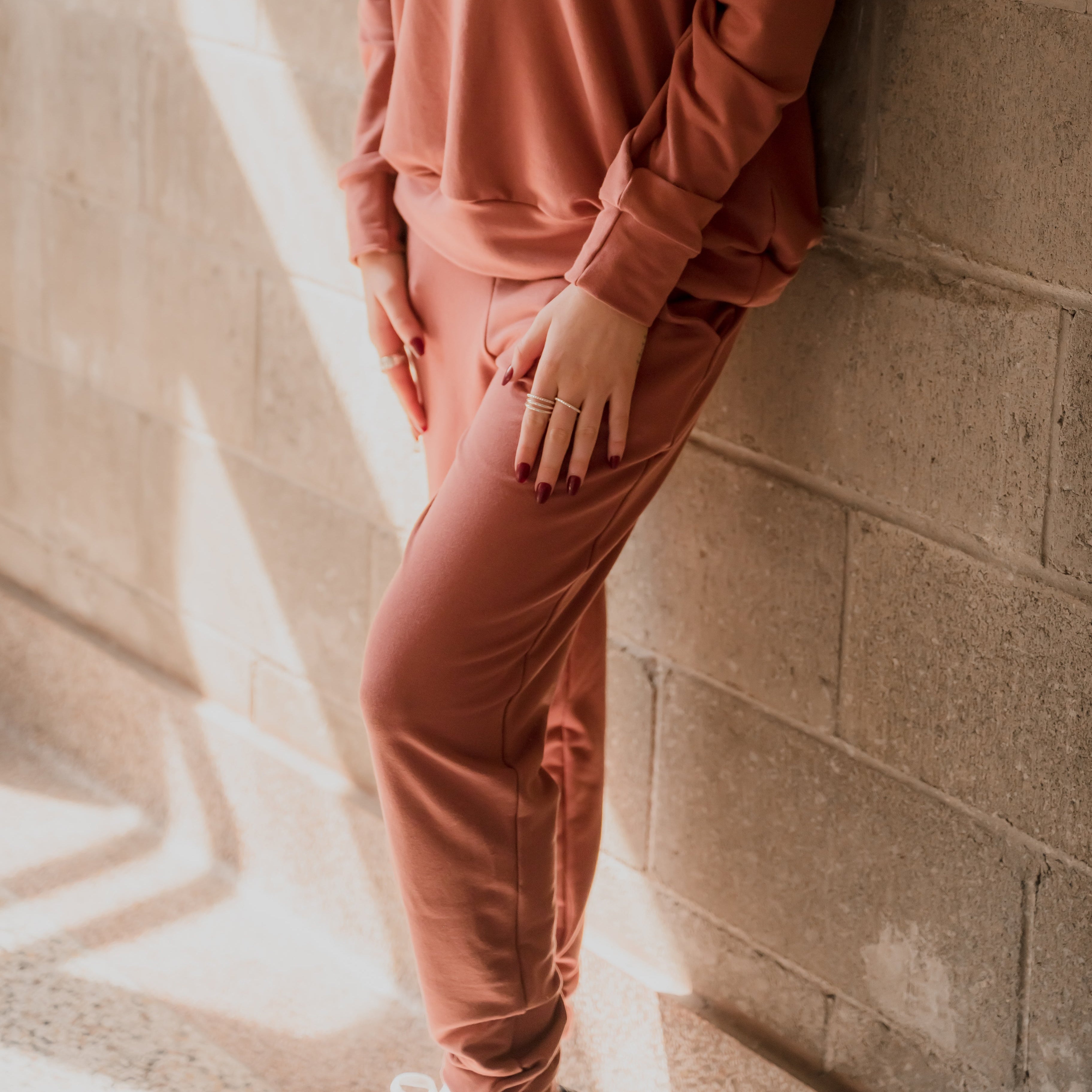 Pantalon style jogger pour femme en bambou rose brique, idéal pour la maternité