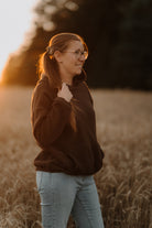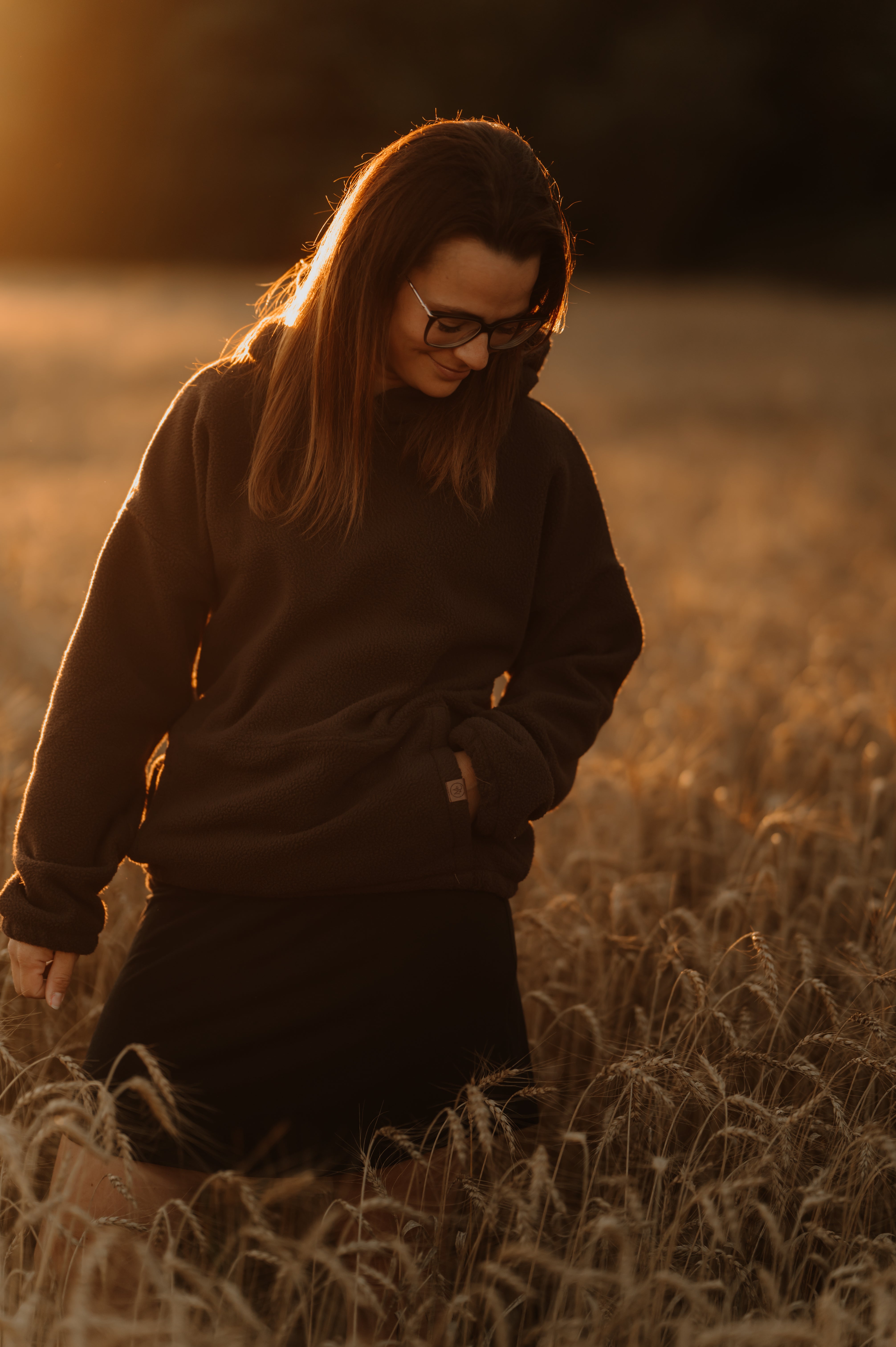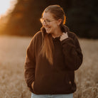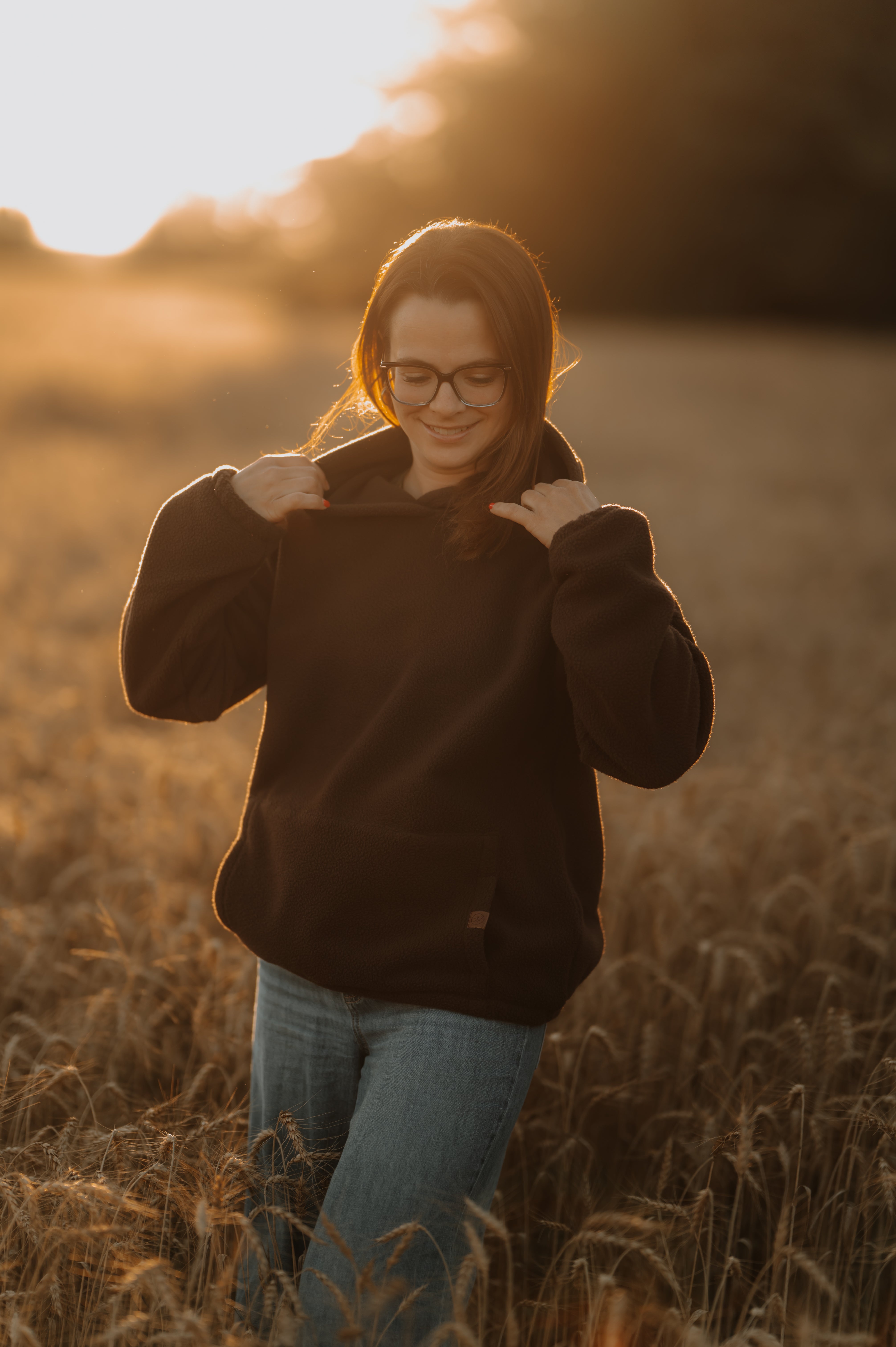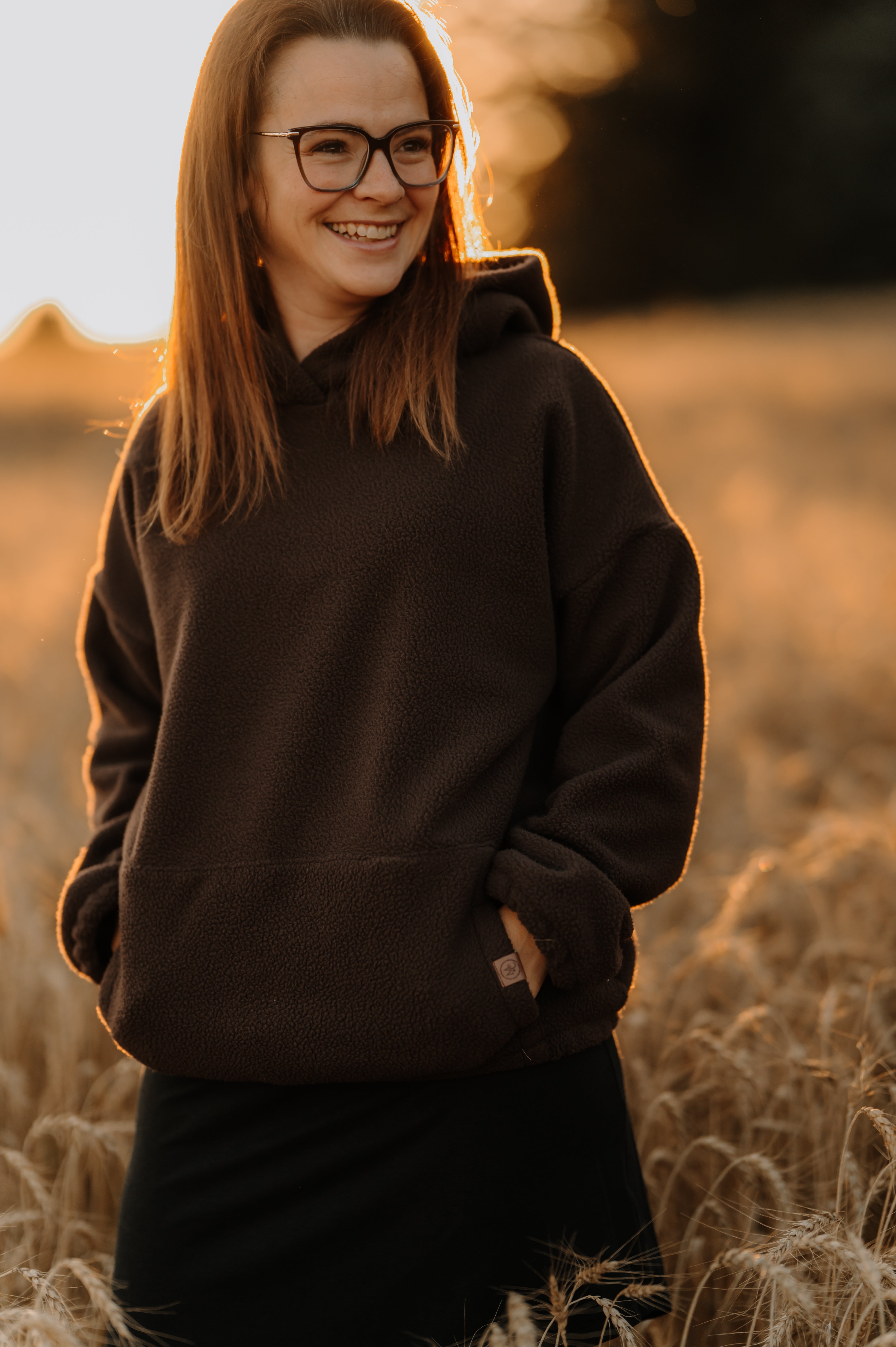 Ce chandail polar à capuchon arbore une coupe décontractée avec une grande poche kangourou pratique, parfaite pour réchauffer vos mains ou y glisser vos essentiels. Sa teinte café noir, élégante et intemporelle, se marie facilement à tous vos looks, que ce soit avec un legging, un jean ou un pantalon de détente.
