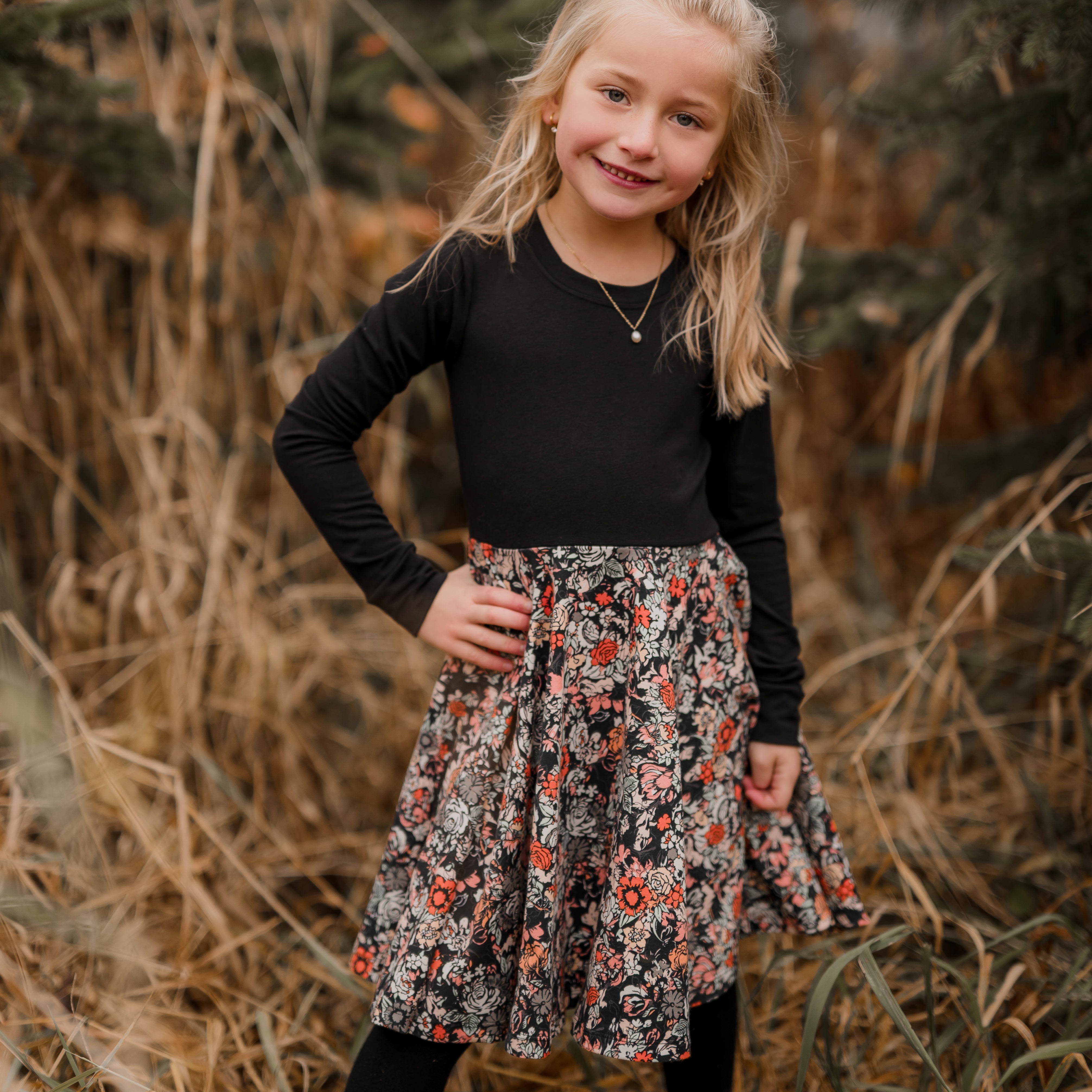 Robe qui tourne à manche longue noir et fleuri pour enfant et junior