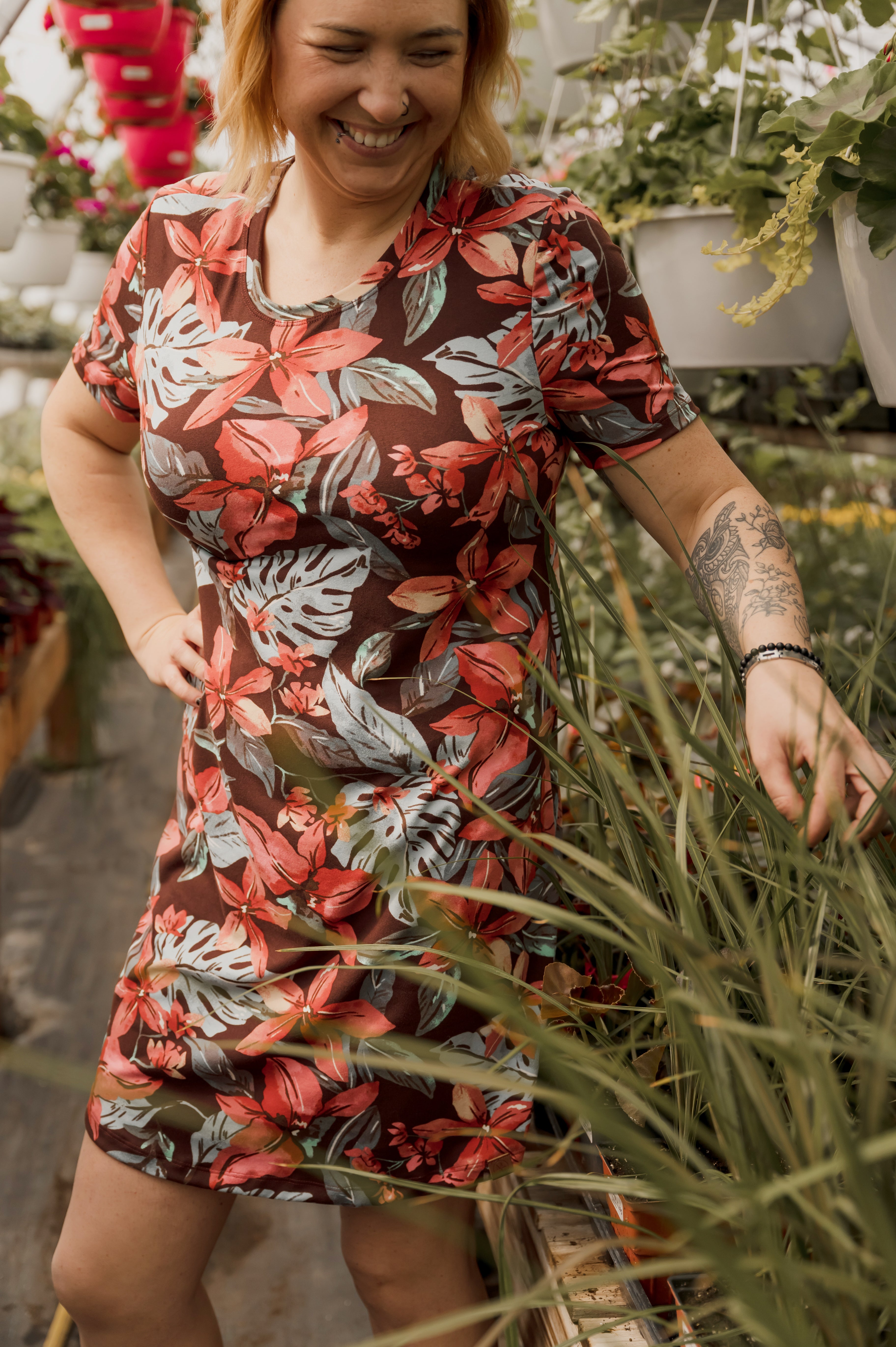 Robe t-shirt à manche courte fleuri brun en polybrush pour femme.