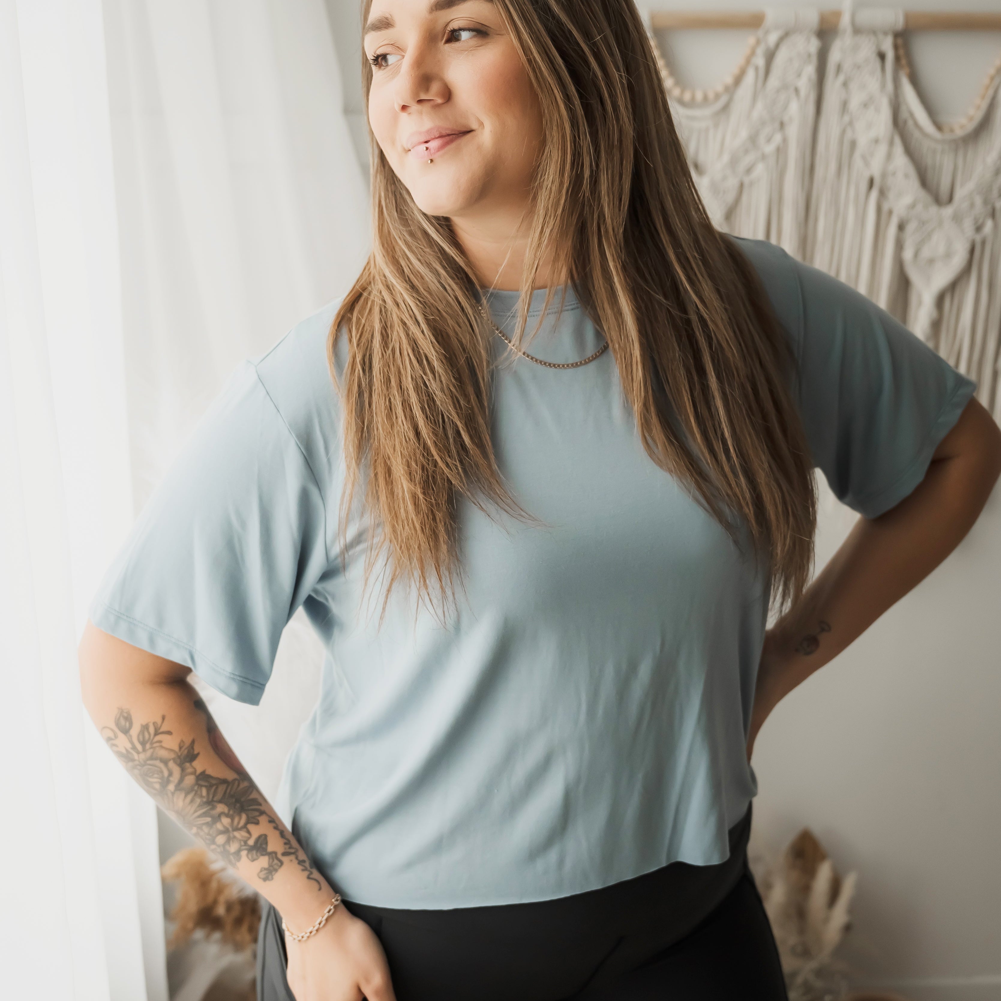 T-shirt Marie crop en bambou bleu ciel pour femme.