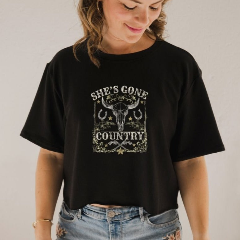 T-shirt Marie crop en bambou noir pour femme - Imprimé She's gone country