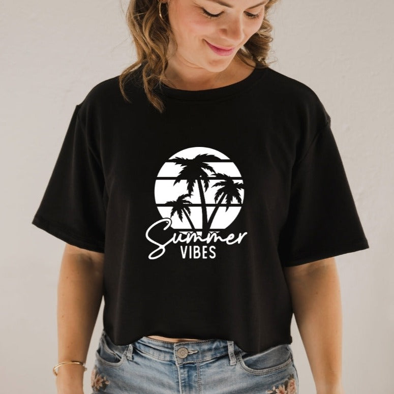 T-shirt Marie crop en bambou noir pour femme - Imprimé Summer vibes