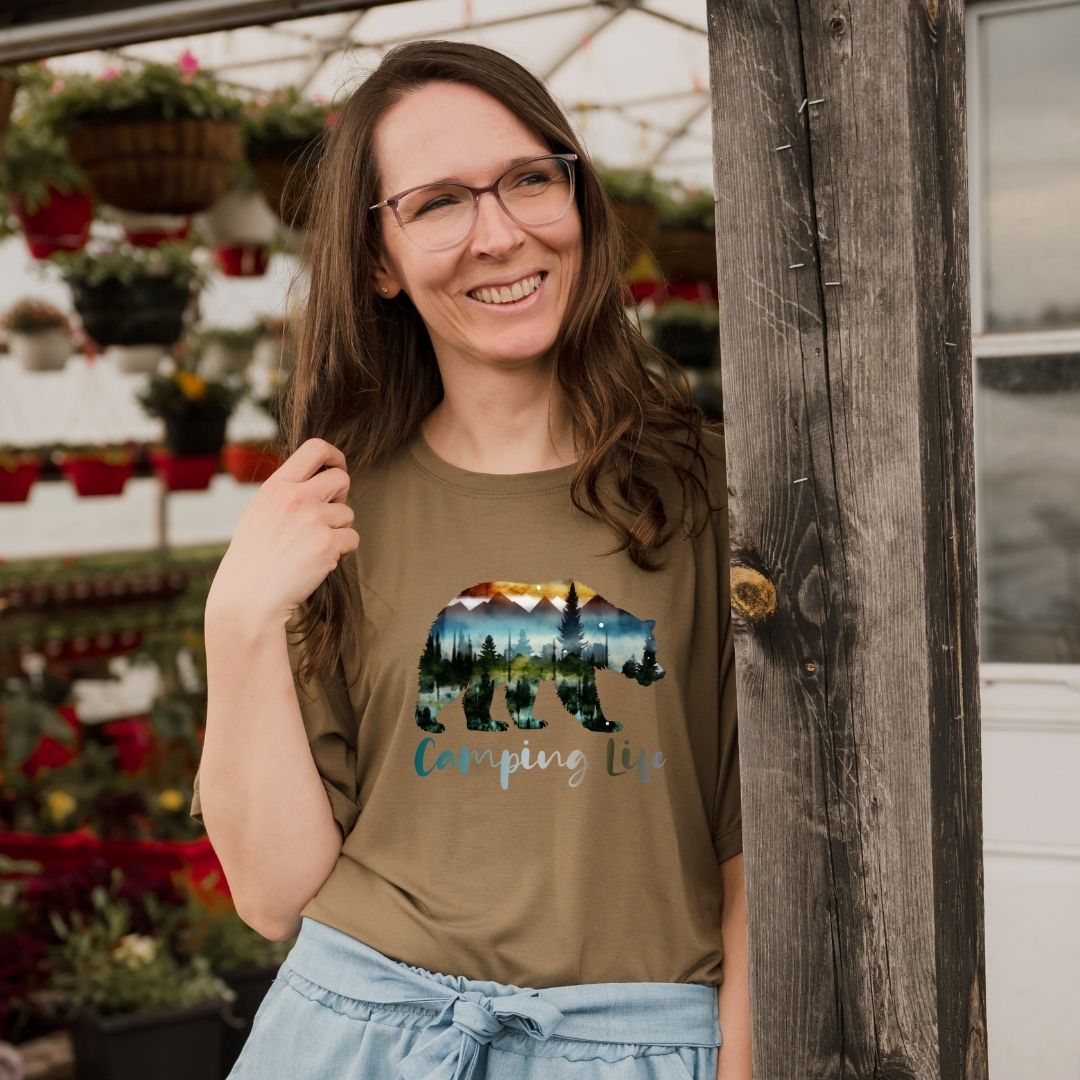 T-shirt Marie crop en bambou olive pour femme - Imprimé CAMPING LIFE