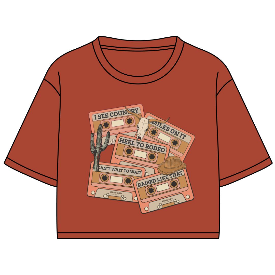T-shirt Marie crop Winslow en bambou orangé pour femme - Imprimé Cassettes