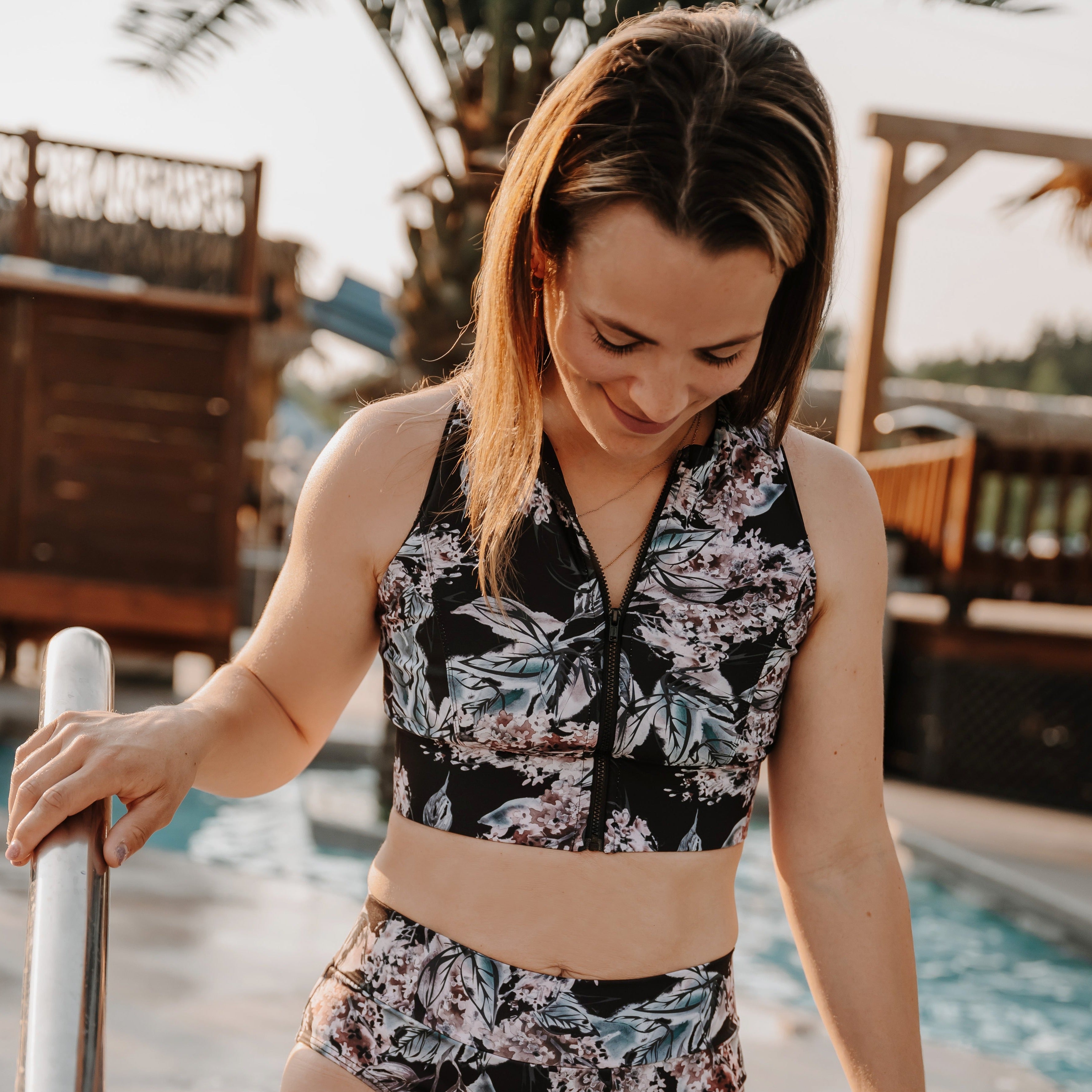 Top de sport pour femme doublé à col haut avec zip fleuri