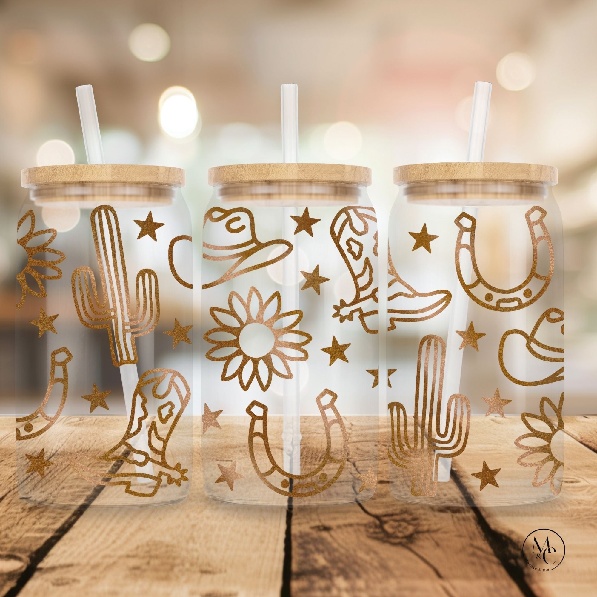 Verre en verre clair 16 oz avec couvercle en bambou et paille - Country gold