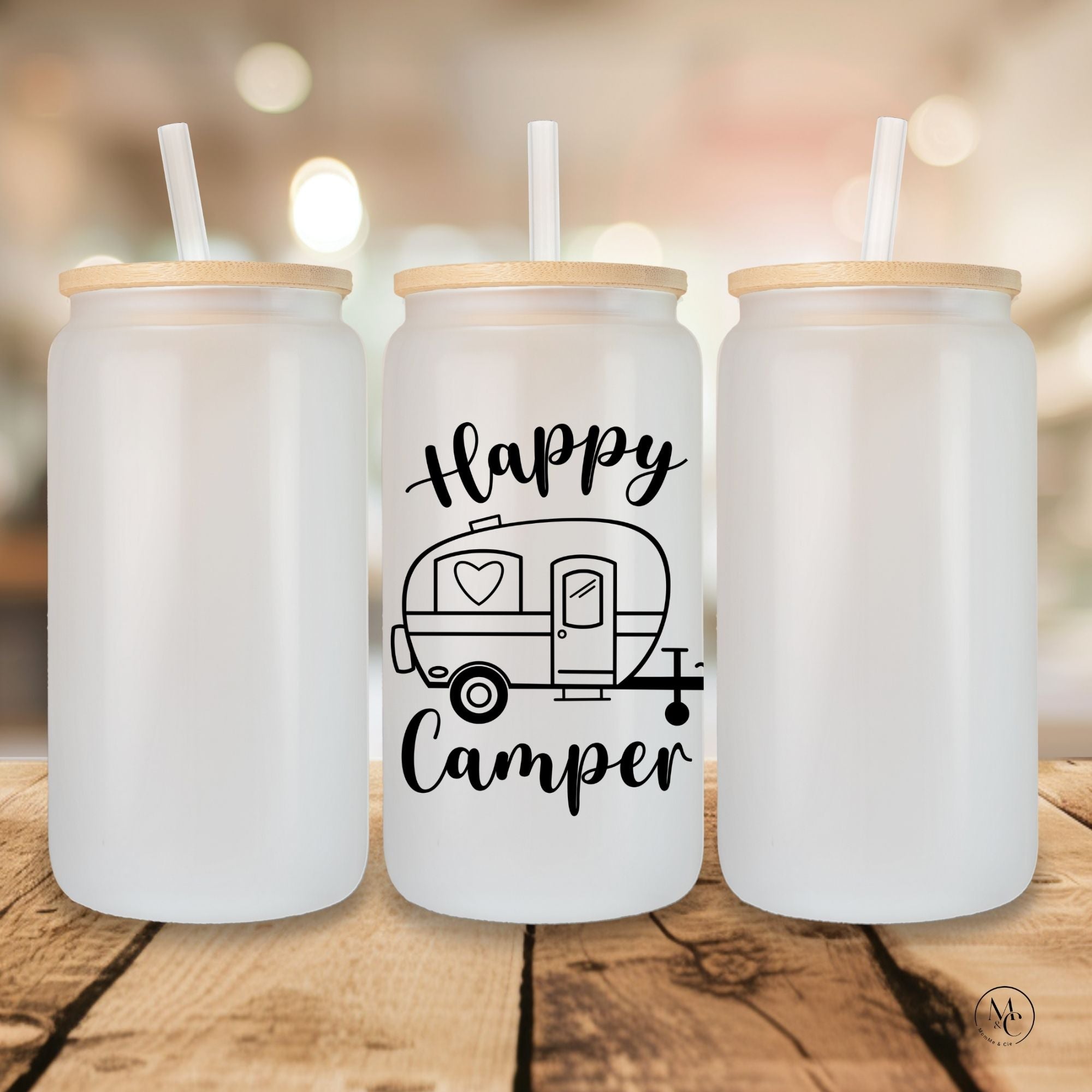 Verre en verre givré 16 oz avec couvercle en bambou et paille HAPPY CAMPER