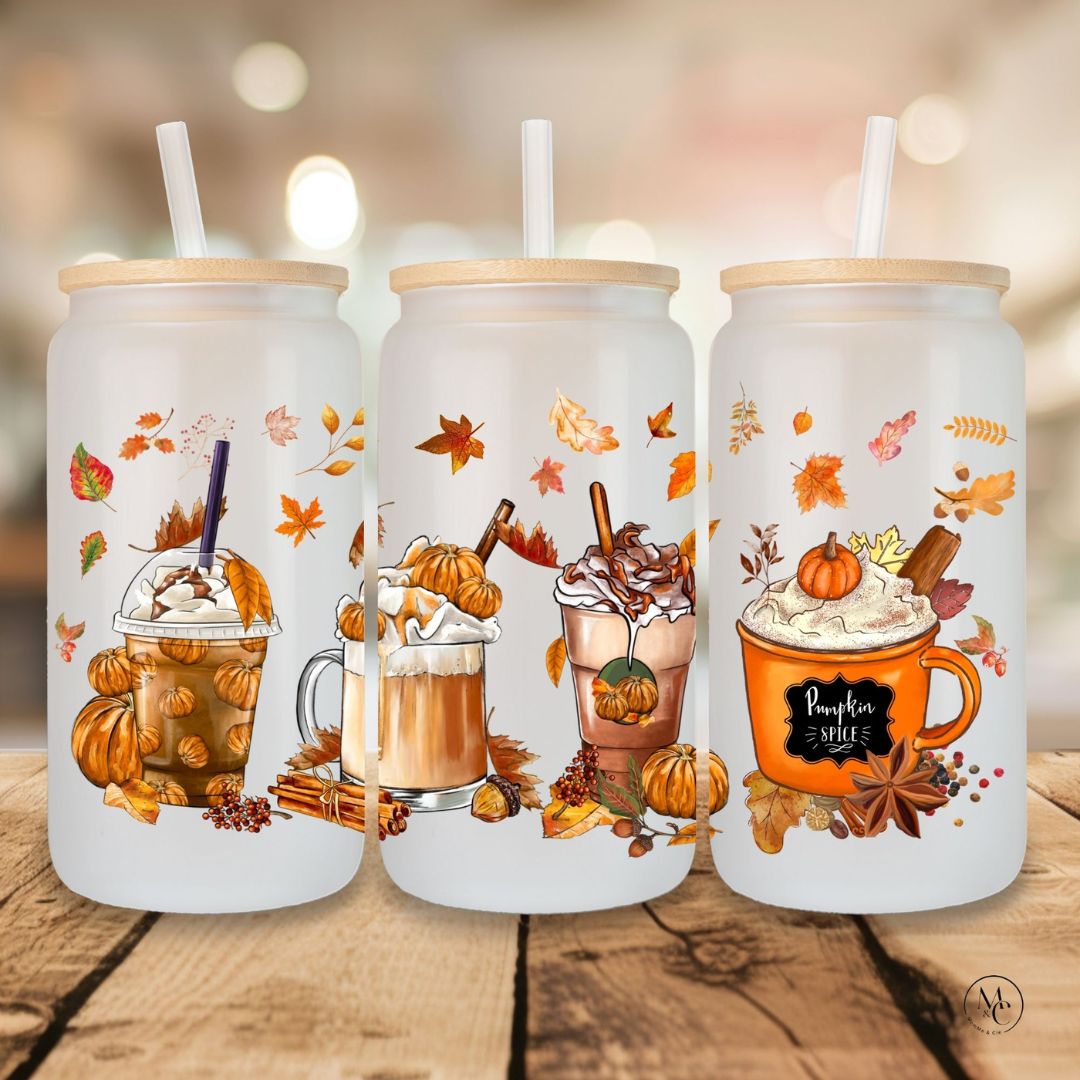 Verre en verre givré 16 oz avec couvercle en bambou et paille - PUMPKIN SPICE